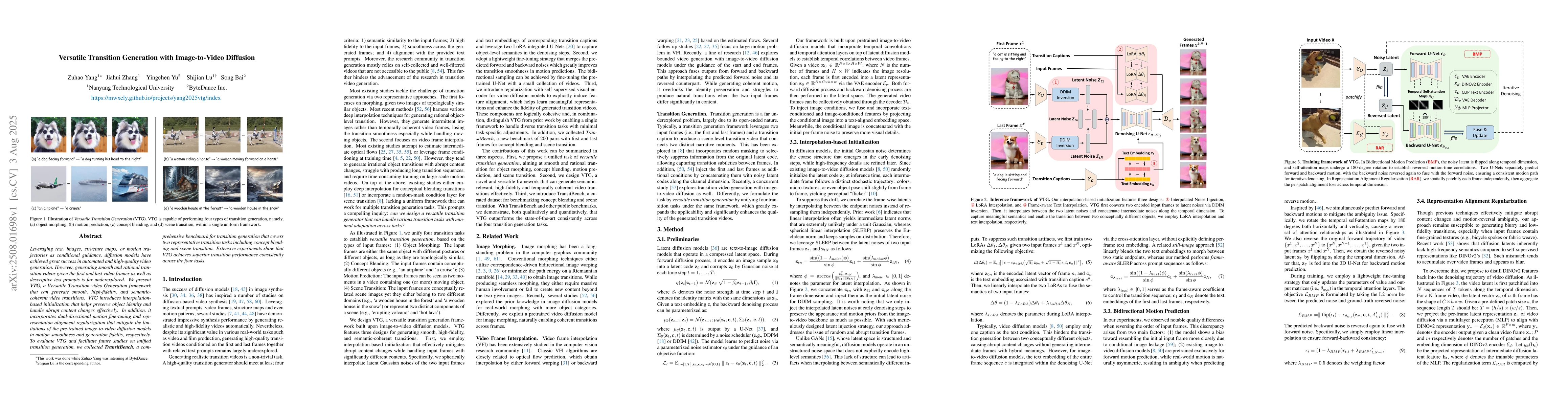 Leveraging text, images, structure maps, or motion trajectories as conditional guidance, diffusion models have achieved great success in automated and high-quality video generation. However, generating smooth and rational transition videos given the first and last video frames as well as descriptive text prompts is far underexplored. We present VTG, a Versatile Transition video Generation framework that can generate smooth, high-fidelity, and semantically coherent video transitions. VTG introduces interpolation-based initialization that helps preserve object identity and handle abrupt content changes effectively. In addition, it incorporates dual-directional motion fine-tuning and representation alignment regularization to mitigate the limitations of pre-trained image-to-video diffusion models in motion smoothness and generation fidelity, respectively. To evaluate VTG and facilitate future studies on unified transition generation, we collected TransitBench, a comprehensive benchmark for transition generation covering two representative transition tasks: concept blending and scene transition. Extensive experiments show that VTG achieves superior transition performance consistently across all four tasks.