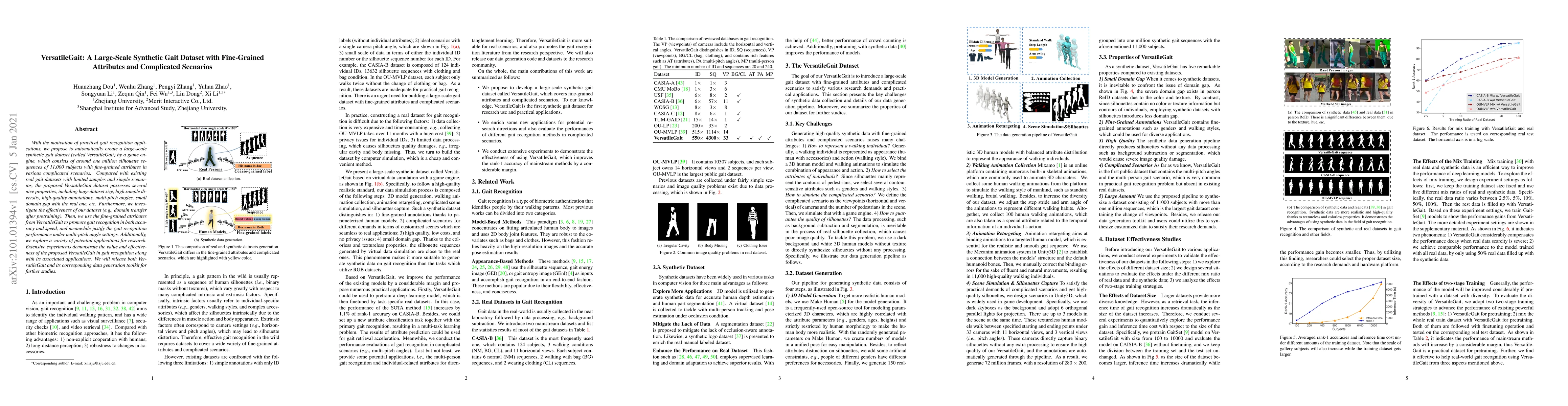 VersatileGait is a large-scale synthetic gait dataset created using a game engine, featuring one million silhouette sequences of 11,000 subjects with fine-grained attributes across complex scenarios. The dataset is shown to enhance gait recognition accuracy and speed, and will be released along with a data generation toolkit.