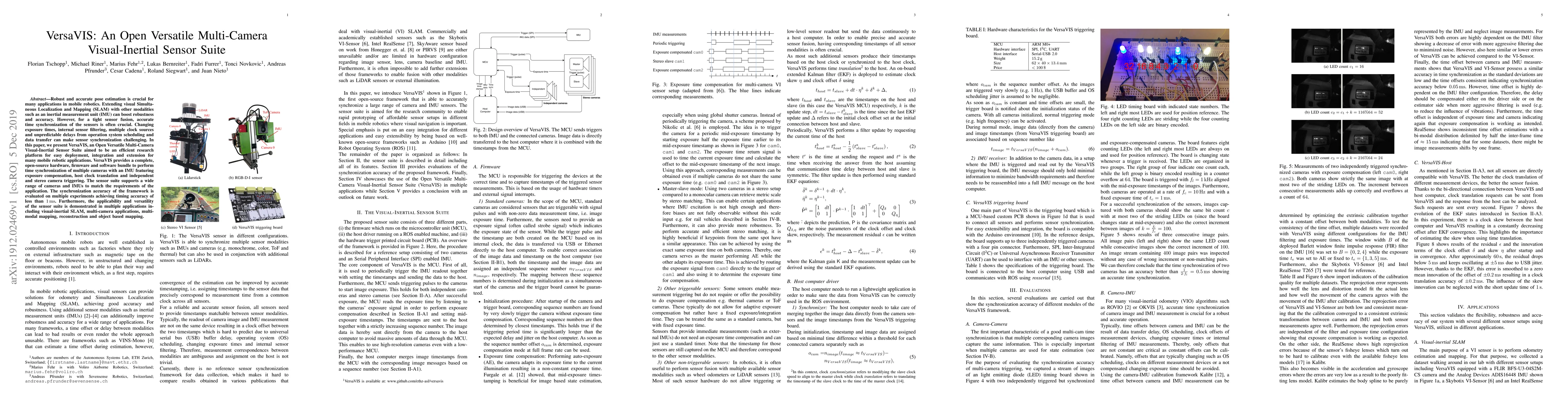 The paper presents VersaVIS, an open-source multi-camera visual-inertial sensor suite designed for robust and accurate pose estimation in mobile robotics. It ensures tight sensor fusion by addressing challenges in time synchronization through exposure compensation, host clock translation, and independent/stereo camera triggering.