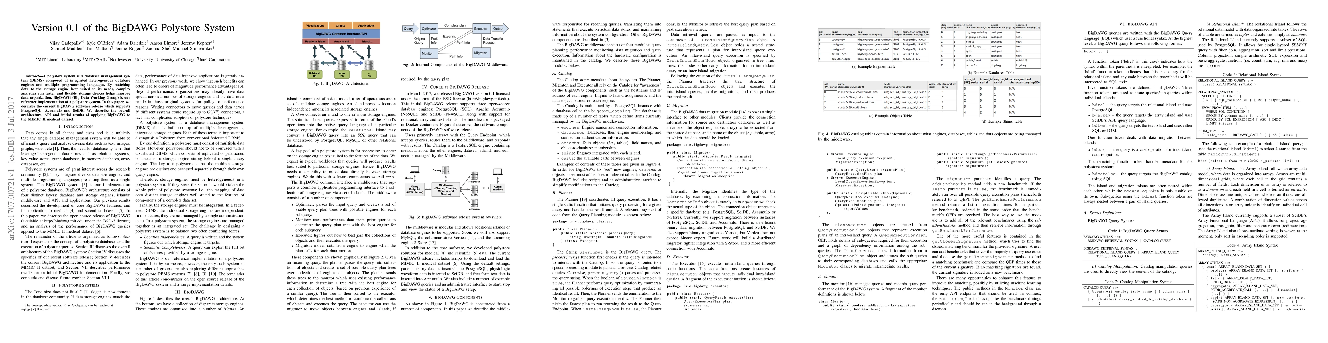 This paper introduces Version 0.1 of the BigDAWG polystore system, which integrates PostgreSQL, Accumulo, and SciDB to optimize complex analytics and data organization. Initial results from applying BigDAWG to the MIMIC II medical dataset demonstrate its effectiveness.