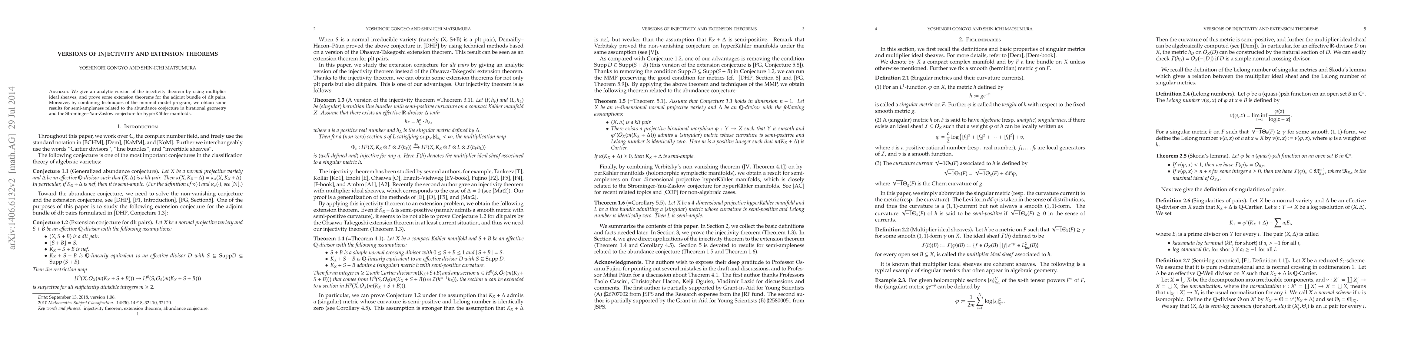This paper presents an analytic version of the injectivity theorem using multiplier ideal sheaves and proves extension theorems for the adjoint bundle in dlt pairs. It also combines minimal model program techniques to derive results for semi-ampleness concerning the abundance conjecture and the Strominger-Yau-Zaslow conjecture in birational geometry and hyperKähler manifolds.