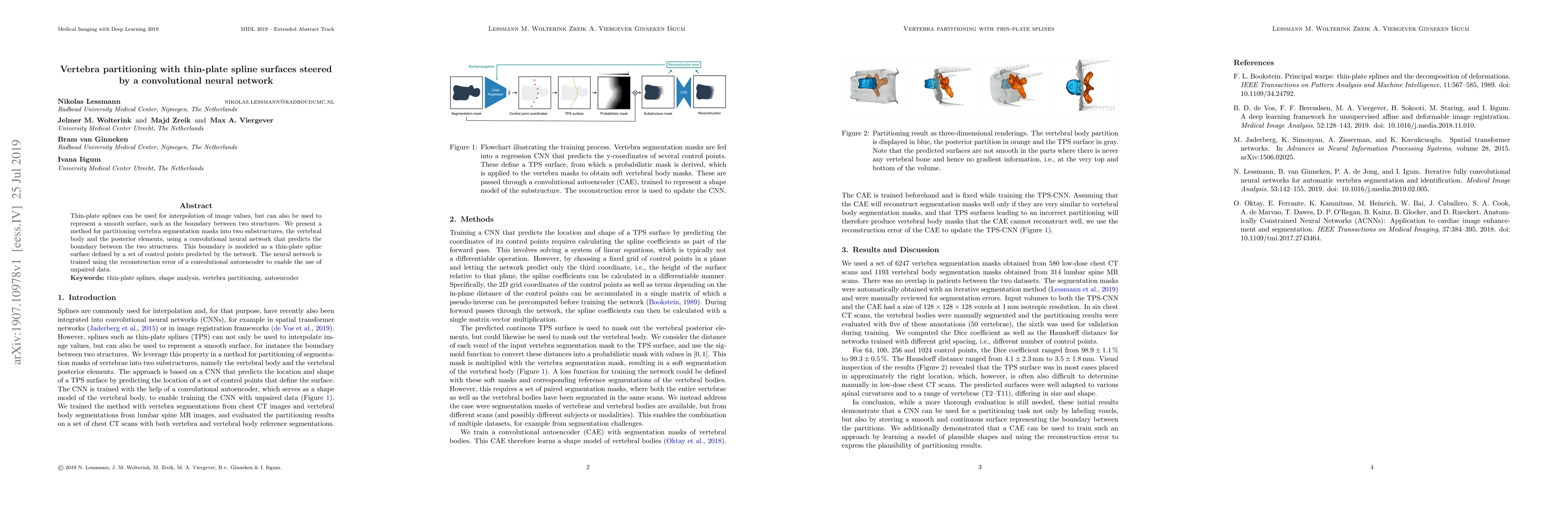 Thin-plate splines can be used for interpolation of image values, but can also be used to represent a smooth surface, such as the boundary between two structures. We present a method for partitioning vertebra segmentation masks into two substructures, the vertebral body and the posterior elements, using a convolutional neural network that predicts the boundary between the two structures. This boundary is modeled as a thin-plate spline surface defined by a set of control points predicted by the network. The neural network is trained using the reconstruction error of a convolutional autoencoder to enable the use of unpaired data.