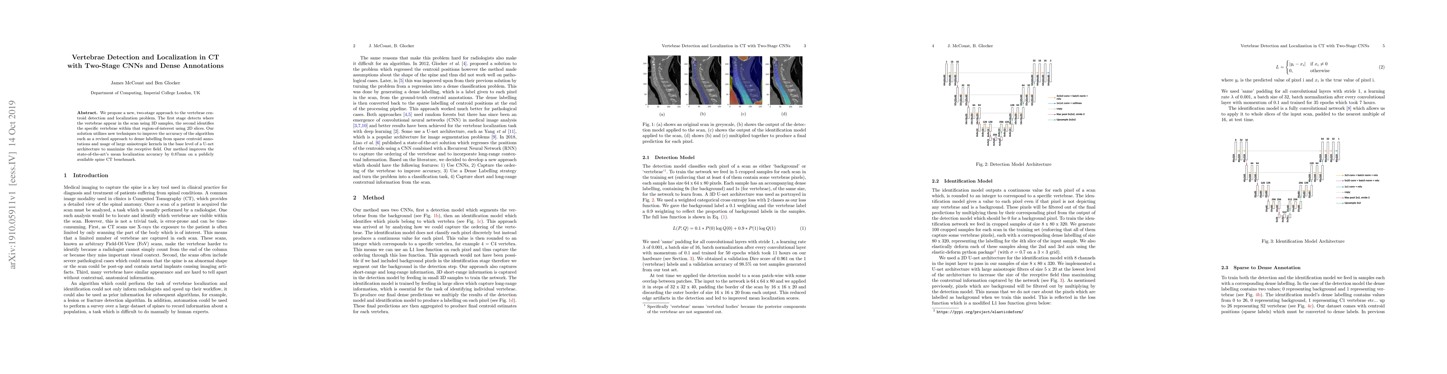 This paper introduces a two-stage CNN method for vertebrae detection and localization in CT scans, improving accuracy by 0.87mm over existing benchmarks. The approach uses 3D samples for initial detection and 2D slices for precise localization, enhanced by dense labelling and large anisotropic kernels.