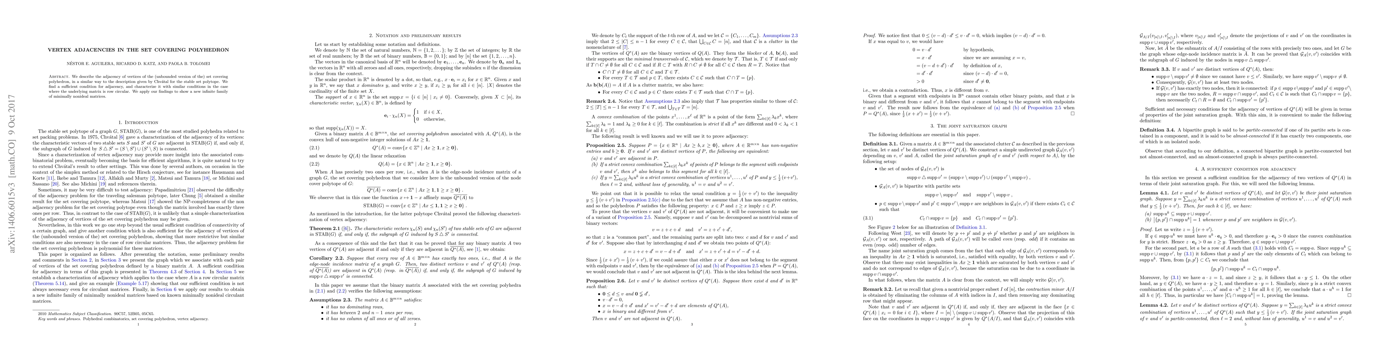 We describe the adjacency of vertices of the (unbounded version of the) set covering polyhedron, in a similar way to the description given by Chvatal for the stable set polytope. We find a sufficient condition for adjacency, and characterize it with similar conditions in the case where the underlying matrix is row circular. We apply our findings to show a new infinite family of minimally nonideal matrices.
