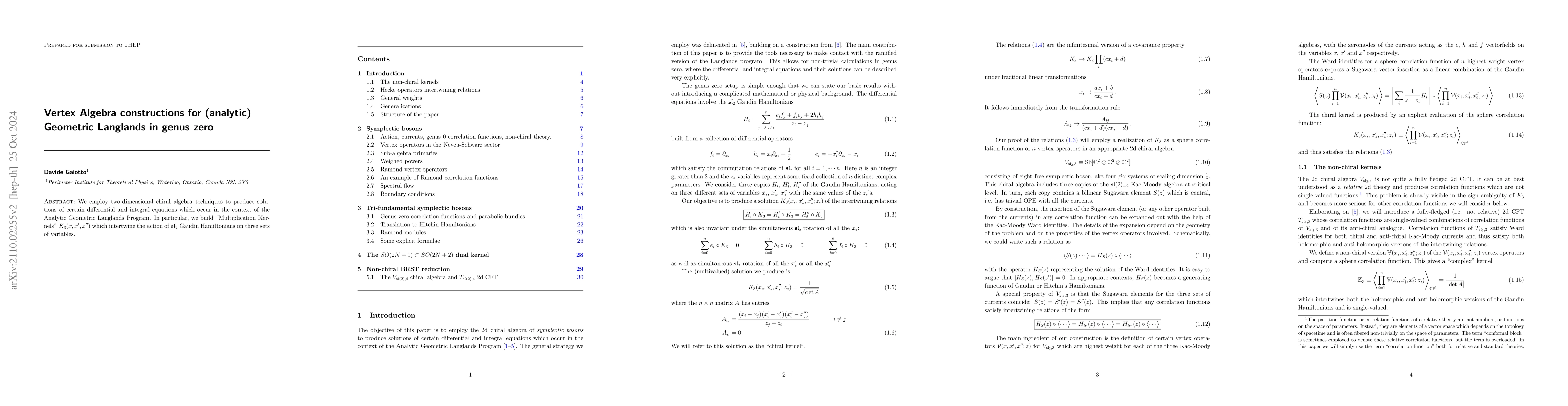 We employ two-dimensional chiral algebra techniques to produce solutions of certain differential and integral equations which occur in the context of the Analytic Geometric Langlands Program.