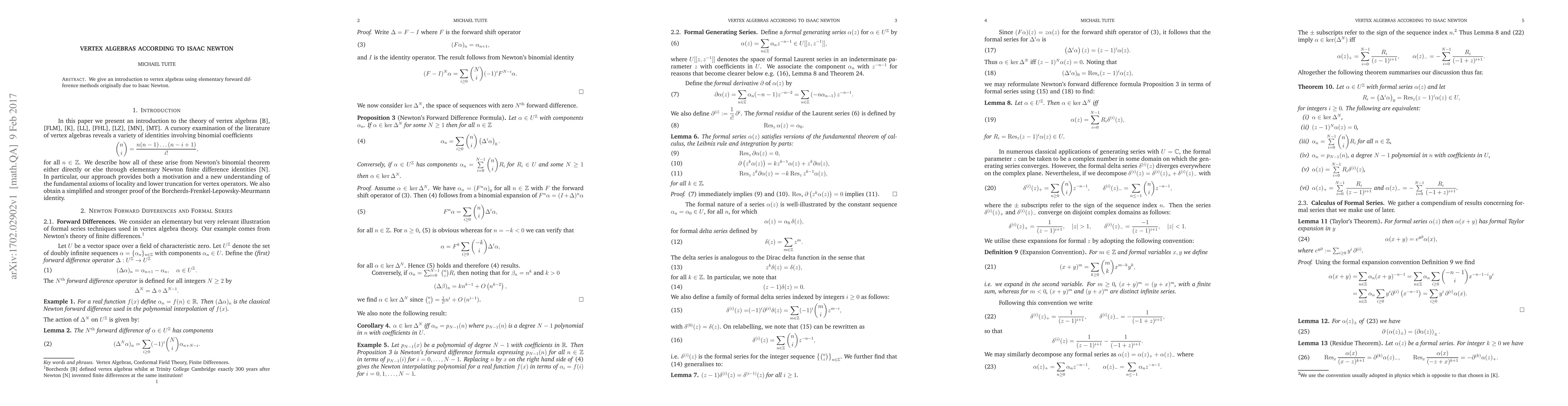 This paper introduces vertex algebras through elementary forward difference methods that trace back to Isaac Newton's original ideas, offering a novel perspective on the mathematical structure. The work bridges historical techniques with modern algebraic concepts.