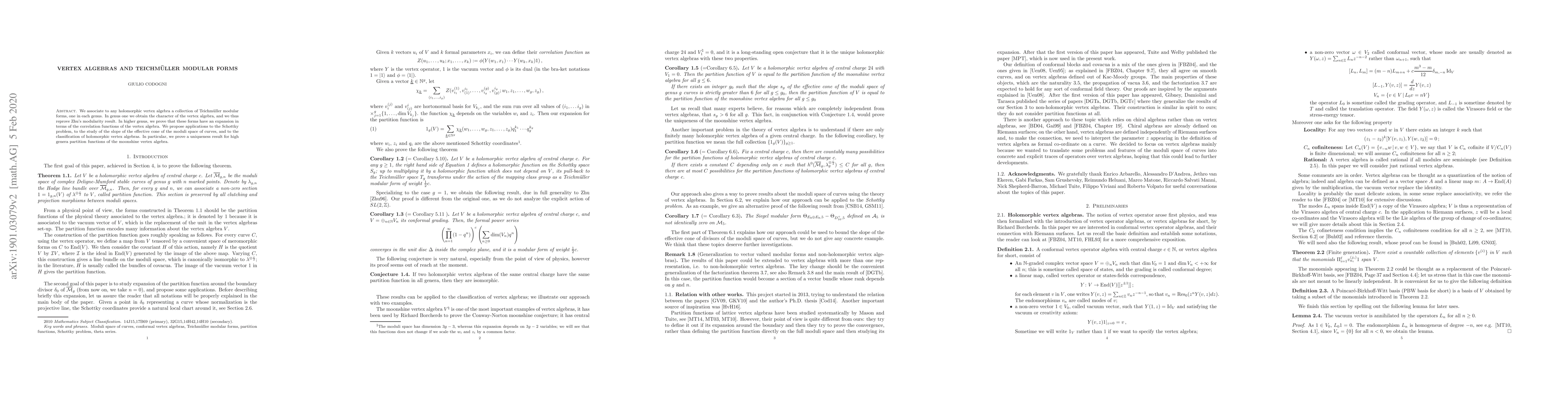 This research links holomorphic vertex algebras to Teichmüller modular forms, generating one form per genus. In genus one, it reaffirms Zhu's modularity outcome via the vertex algebra character. For higher genus, it establishes an expansion of these forms in the vertex algebra's correlation functions, proposing applications in Schottky problem, moduli space slope study, and vertex algebra classification. Notably, it proves uniqueness for high genus partition functions of the moonshine vertex algebra.