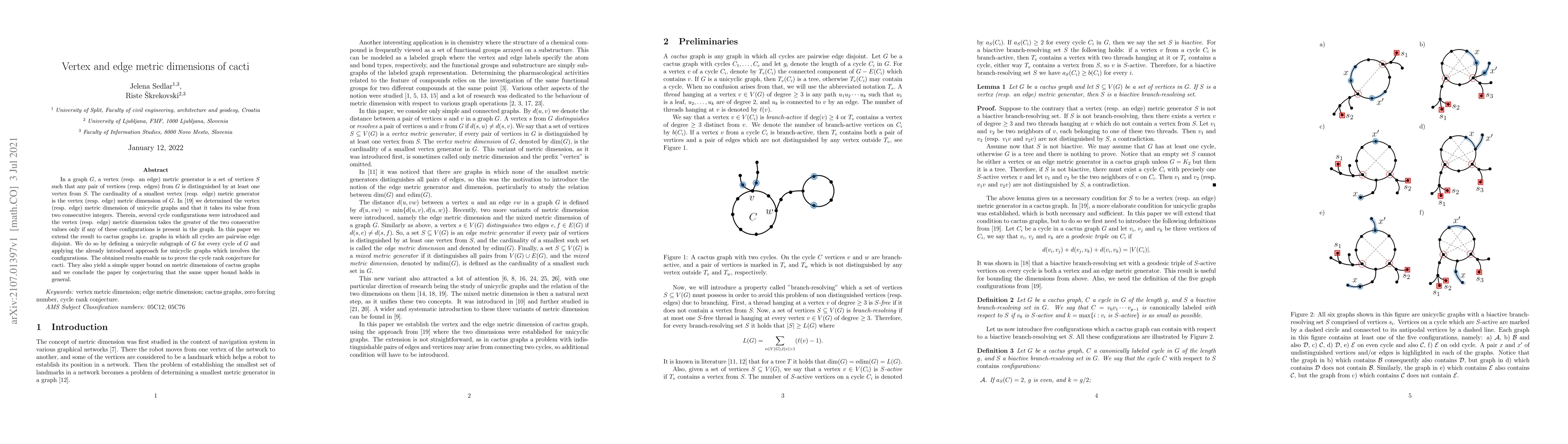 In a graph G; a vertex (resp. an edge) metric generator is a set of vertices S such that any pair of vertices (resp. edges) from G is distinguished by at least one vertex from S: The cardinality of a smallest vertex (resp. edge) metric generator is the vertex (resp. edge) metric dimension of G: In [19] we determined the vertex (resp. edge) metric dimension of unicyclic graphs and that it takes its value from two consecutive integers. Therein, several cycle configurations were introduced and the vertex (resp. edge) metric dimension takes the greater of the two consecutive values only if any of these configurations is present in the graph. In this paper we extend the result to cactus graphs i.e. graphs in which all cycles are pairwise edge disjoint. We do so by defining a unicyclic subgraph of G for every cycle of G and applying the already introduced approach for unicyclic graphs which involves the configurations. The obtained results enable us to prove the cycle rank conjecture for cacti. They also yield a simple upper bound on metric dimensions of cactus graphs and we conclude the paper by conjecturing that the same upper bound holds in general.
