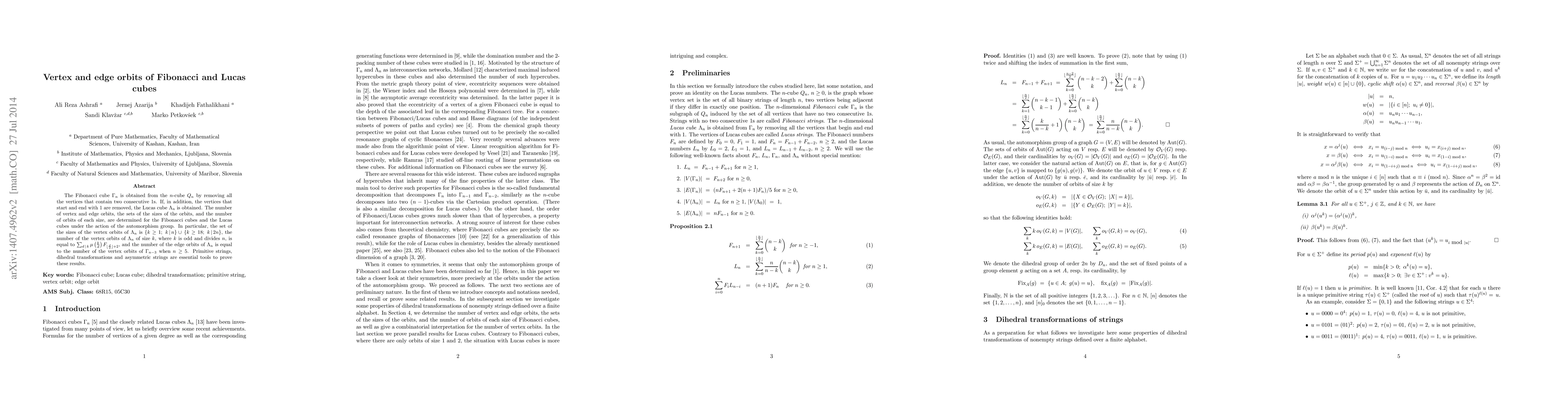 This paper determines the number of vertex and edge orbits in Fibonacci and Lucas cubes, revealing the structure of the vertex orbits in Lucas cubes and the relationship between edge orbits in Lucas and Fibonacci cubes. Key results include specific formulas for the count of vertex orbits based on divisor properties and the use of dihedral transformations to prove these findings.