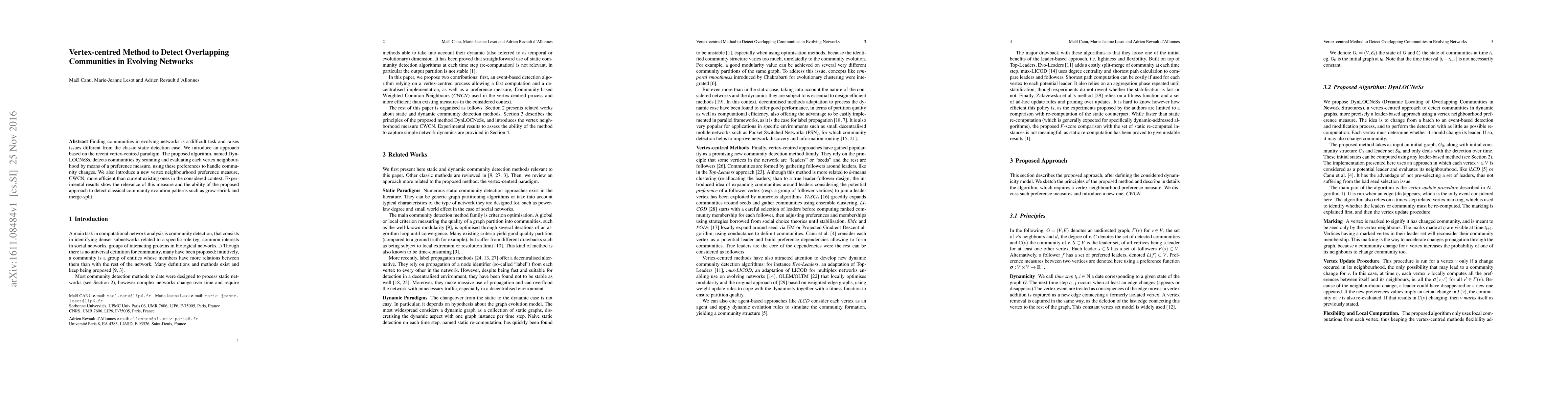 The paper introduces DynLOCNeSs, a vertex-centric algorithm for detecting communities in evolving networks. It utilizes a new preference measure, CWCN, to handle community changes independently and in parallel, effectively identifying patterns like grow-shrink and merge-split.