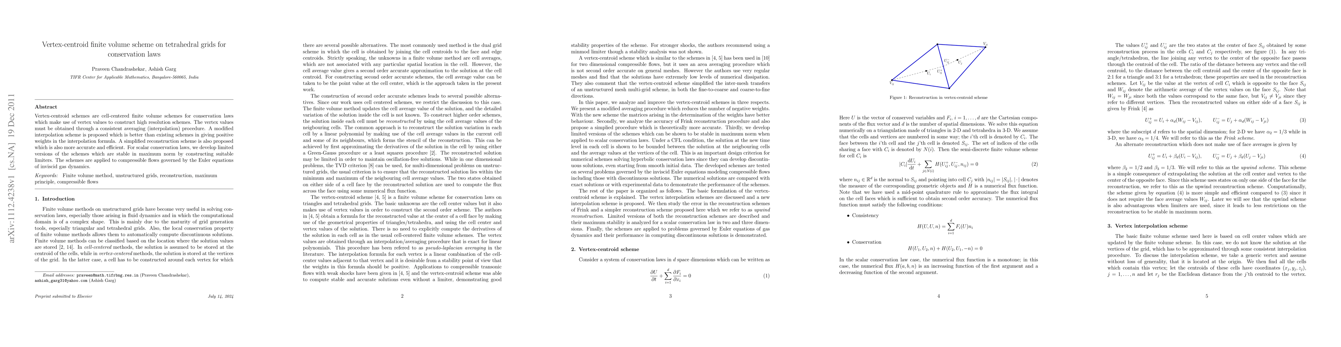 This paper proposes a modified vertex-centroid finite volume scheme for tetrahedral grids to solve conservation laws, featuring improved interpolation and reconstruction methods for higher accuracy and efficiency. The developed schemes are applied to compressible flows described by the Euler equations, ensuring stability through suitable limiters.