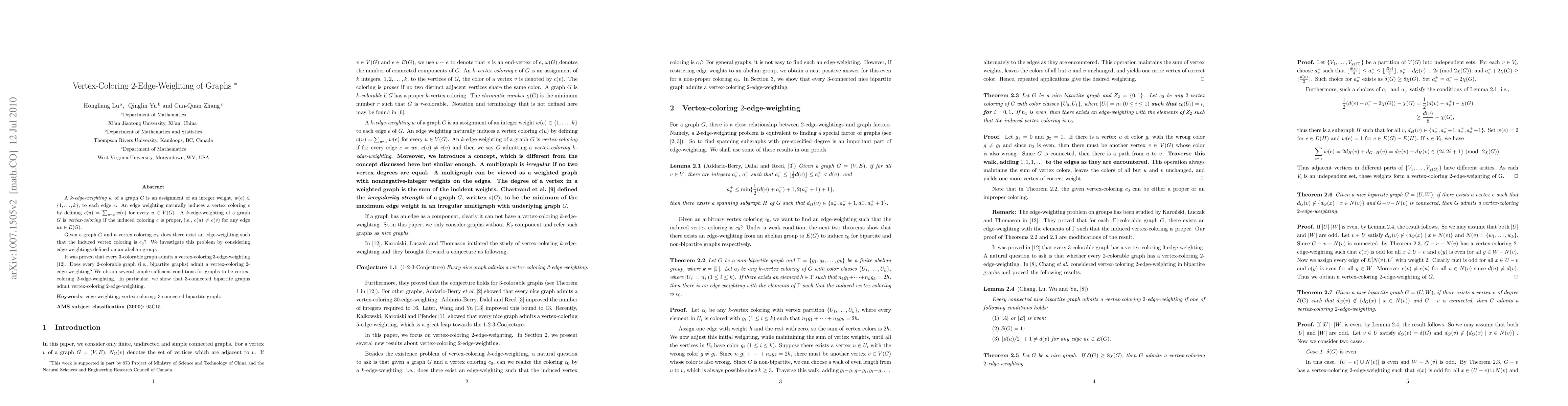 This paper explores the problem of determining whether a given vertex coloring can be induced by a 2-edge-weighting, where each edge receives a weight from 1 to 2, ensuring a proper vertex coloring. It provides sufficient conditions for certain classes of graphs, notably showing that 3-connected bipartite graphs can be vertex-coloring 2-edge-weighted.