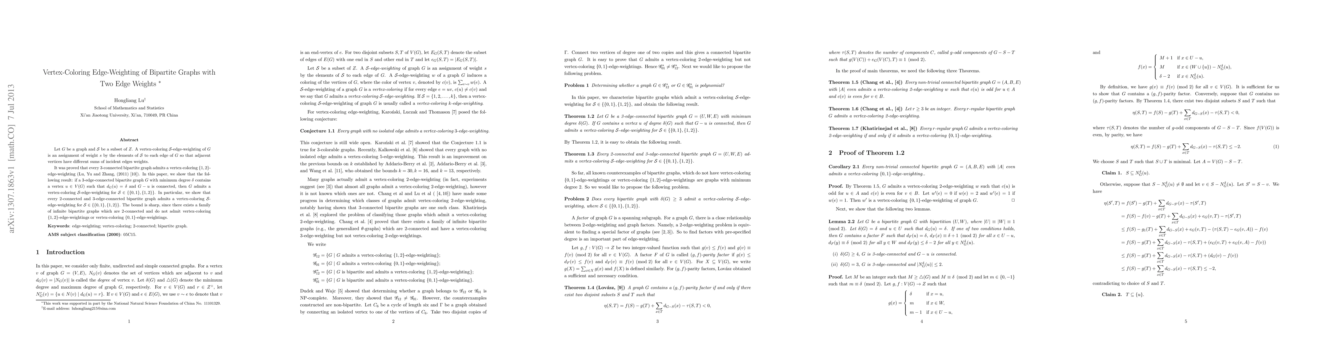 Let $G$ be a graph and $\mathcal {S}$ be a subset of $Z$. A vertex-coloring $\mathcal {S}$-edge-weighting of $G$ is an assignment of weight $s$ by the elements of $\mathcal {S}$ to each edge of $G$ so that adjacent vertices have different sums of incident edges weights. It was proved that every 3-connected bipartite graph admits a vertex-coloring $\{1,2\}$-edge-weighting (Lu, Yu and Zhang, (2011) \cite{LYZ}). In this paper, we show that the following result: if a 3-edge-connected bipartite graph $G$ with minimum degree $\delta$ contains a vertex $u\in V(G)$ such that $d_G(u)=\delta$ and $G-u$ is connected, then $G$ admits a vertex-coloring $\mathcal {S}$-edge-weighting for $\mathcal {S}\in \{\{0,1\},\{1,2\}\}$. In particular, we show that every 2-connected and 3-edge-connected bipartite graph admits a vertex-coloring $\mathcal {S}$-edge-weighting for $\mathcal {S}\in \{\{0,1\},\{1,2\}\}$. The bound is sharp, since there exists a family of infinite bipartite graphs which are 2-connected and do not admit vertex-coloring $\{1,2\}$-edge-weightings or vertex-coloring $\{0,1\}$-edge-weightings.