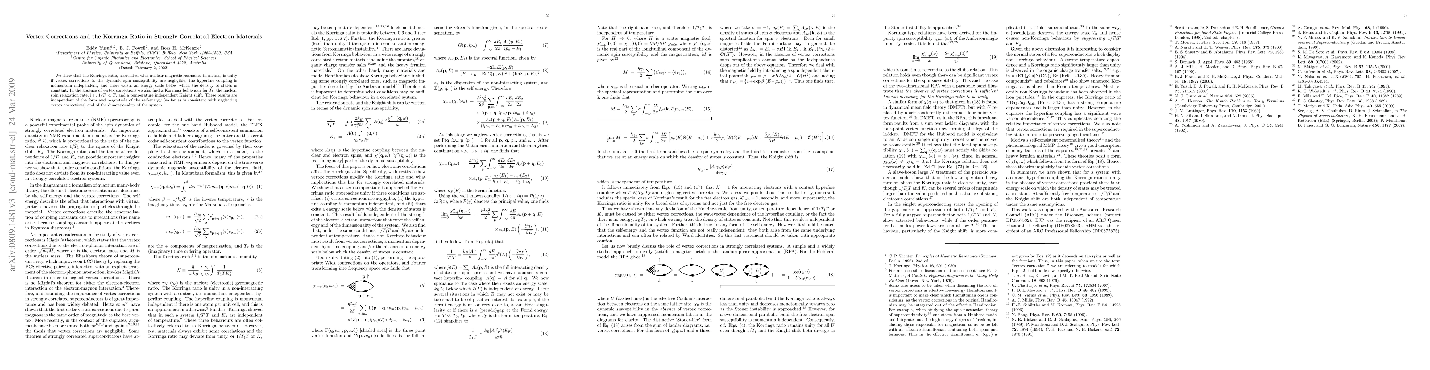 We show that the Korringa ratio, associated with nuclear magnetic resonance in metals, is unity if vertex corrections for the dynamic spin susceptibility are negligible and the hyperfine coupling is momentum independent. In the absence of vertex corrections we also find a Korringa behaviour for $T_1$, the nuclear spin relaxation rate, i.e., $1/T_1\propto T$, and a temperature independent Knight shift. These results are independent of the form and magnitude of the self-energy (so far as is consistent with neglecting vertex corrections) and of the dimensionality of the system.