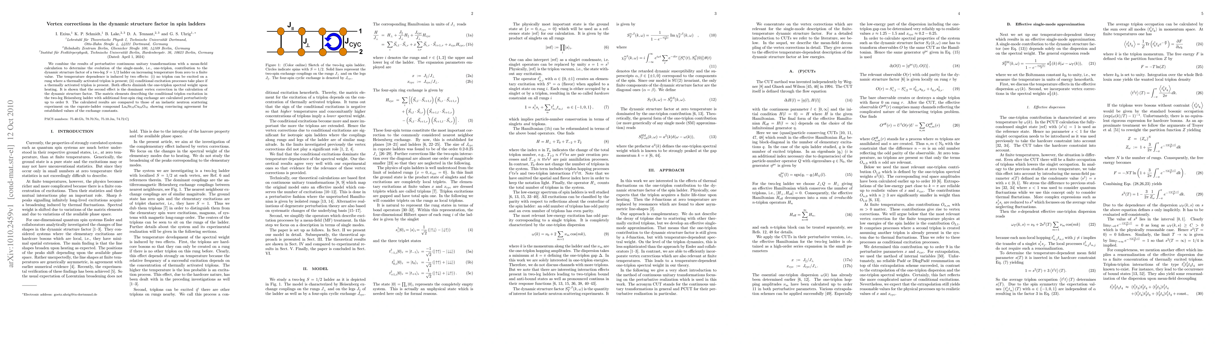The paper presents a method combining perturbative continuous unitary transformations and mean-field calculation to study the temperature-induced changes in the dynamic structure factor of a two-leg S=1/2 spin ladder. Two main thermal effects are identified that reduce the one-triplon spectral weight: rungs with thermally activated triplons cannot excite new ones, and conditional excitation processes occur with present thermally activated triplons. The study finds that conditional excitation is the dominant vertex correction. Perturbative calculations of matrix elements for triplon excitation up to order 9 agree well with experimental data from inelastic neutron scattering on La_4Sr_10Cu_24O_41, validating the proposed model and exchange constants.