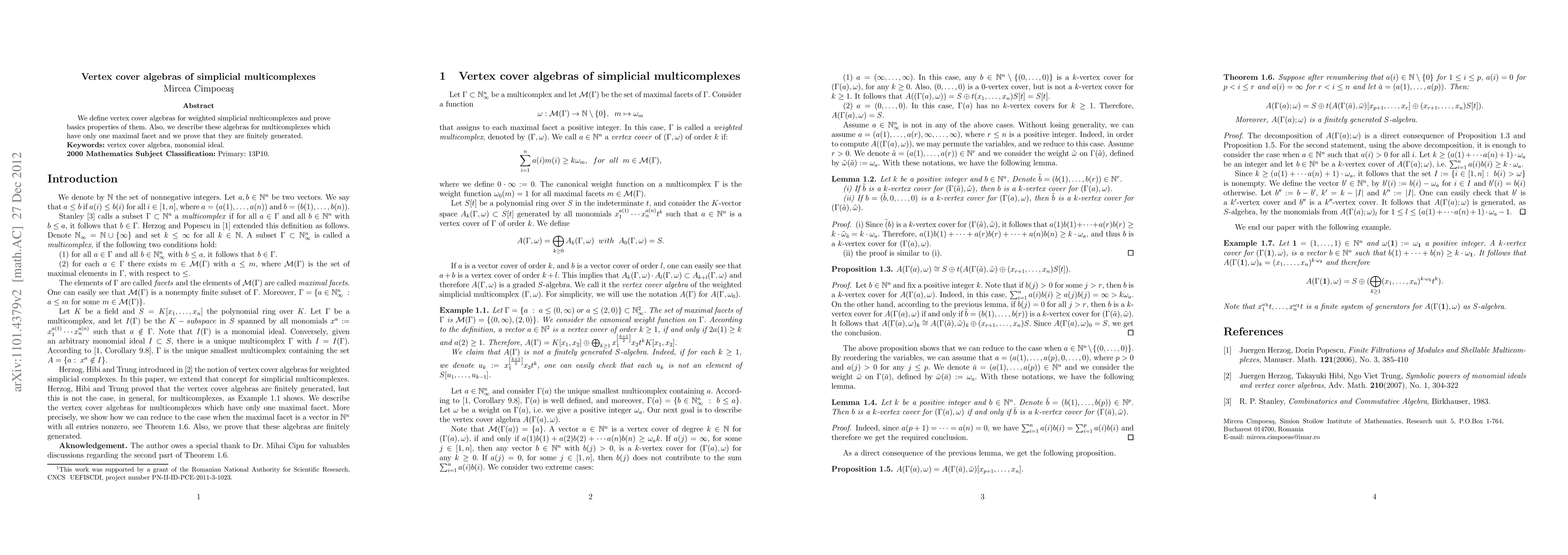 **Summary:** This paper introduces vertex cover algebras for weighted simplicial multicomplexes and explores their fundamental properties. It specifically examines multicomplexes with a single maximal facet, proving their finitely generated nature.