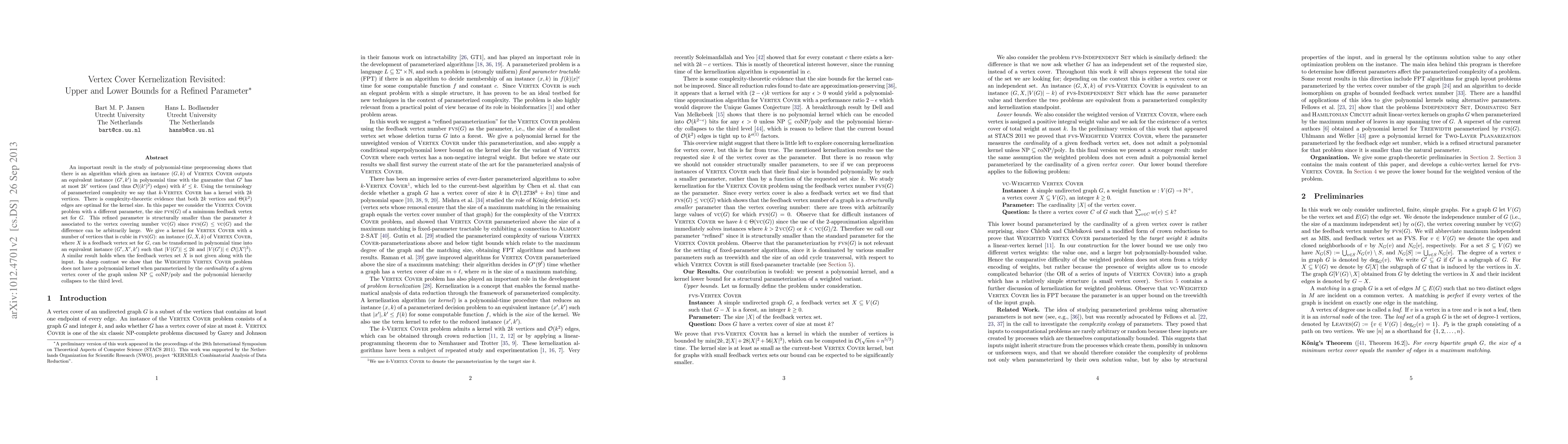An important result in the study of polynomial-time preprocessing shows that there is an algorithm which given an instance (G,k) of Vertex Cover outputs an equivalent instance (G',k') in polynomial time with the guarantee that G' has at most 2k' vertices (and thus O((k')^2) edges) with k' <= k. Using the terminology of parameterized complexity we say that k-Vertex Cover has a kernel with 2k vertices. There is complexity-theoretic evidence that both 2k vertices and Theta(k^2) edges are optimal for the kernel size. In this paper we consider the Vertex Cover problem with a different parameter, the size fvs(G) of a minimum feedback vertex set for G. This refined parameter is structurally smaller than the parameter k associated to the vertex covering number vc(G) since fvs(G) <= vc(G) and the difference can be arbitrarily large. We give a kernel for Vertex Cover with a number of vertices that is cubic in fvs(G): an instance (G,X,k) of Vertex Cover, where X is a feedback vertex set for G, can be transformed in polynomial time into an equivalent instance (G',X',k') such that |V(G')| <= 2k and |V(G')| <= O(|X'|^3). A similar result holds when the feedback vertex set X is not given along with the input. In sharp contrast we show that the Weighted Vertex Cover problem does not have a polynomial kernel when parameterized by the cardinality of a given vertex cover of the graph unless NP is in coNP/poly and the polynomial hierarchy collapses to the third level.