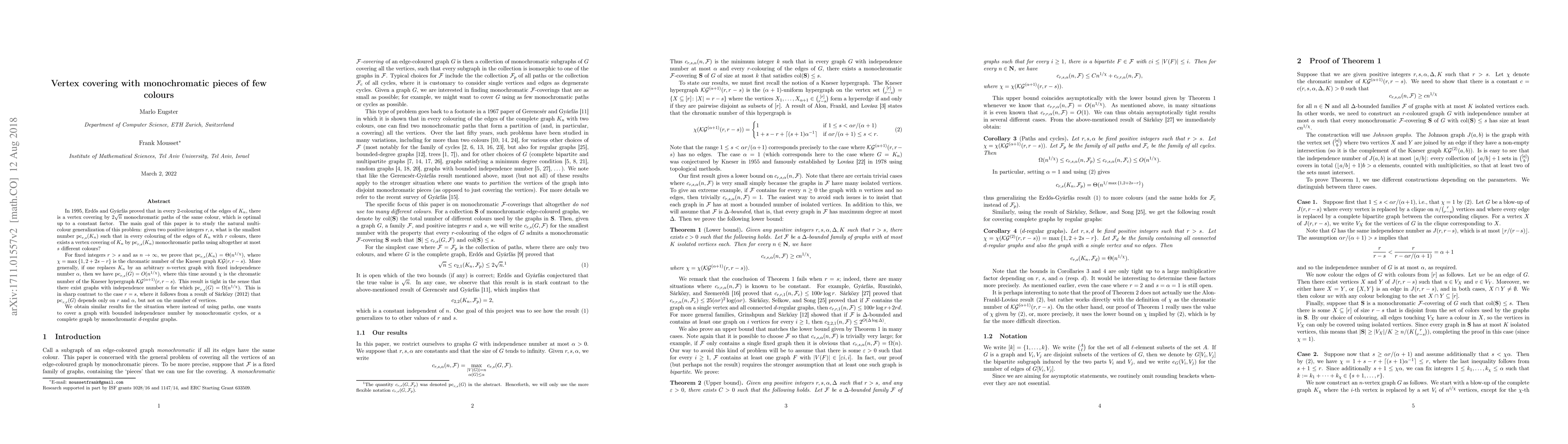 This paper studies vertex covering with monochromatic pieces of few colors, finding that for certain graph structures, the minimum number of colored paths needed to cover a graph is proportional to 1 over the chromatic number of a related hypergraph.