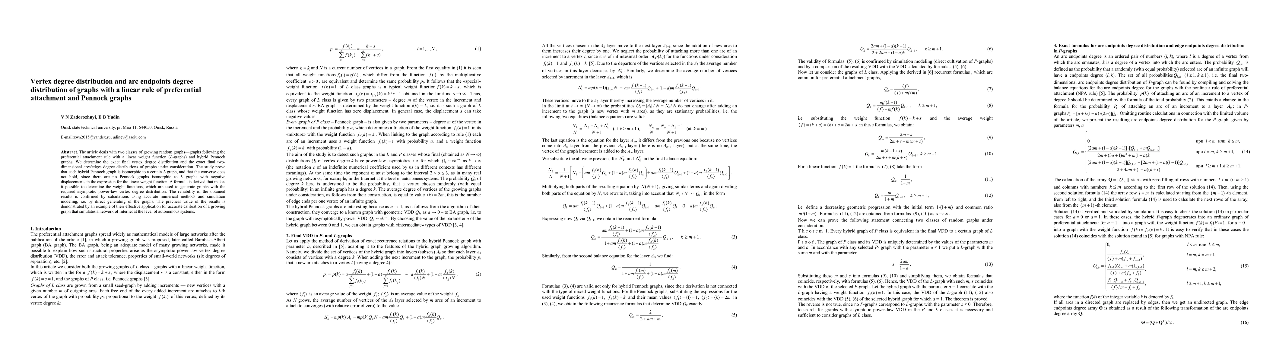 The article deals with two classes of growing random graphs following the preferential attachment rule with a linear weight function, L-graphs, and hybrid Pennock graphs. We determine the exact final vertex degree distribution and the exact final two-dimensional arcs degree distributions of graphs under consideration. The study proves that each hybrid Pennock graph is isomorphic to a certain L graph and that the converse does not hold since there are no Pennock graphs isomorphic to L graphs with negative displacements in the expression for the linear weight function. A formula is derived that makes it possible to determine the weight functions, which are used to generate graphs with the required asymptotic power-law vertex degree distribution. The reliability of the obtained results is confirmed by calculations using accurate numerical methods and simulation modeling, i.e. by direct generating of the graphs. The practical value of the results is demonstrated by an example of their effective application for accurate calibration of a growing graph that simulates a network of Internet at the level of autonomous systems.