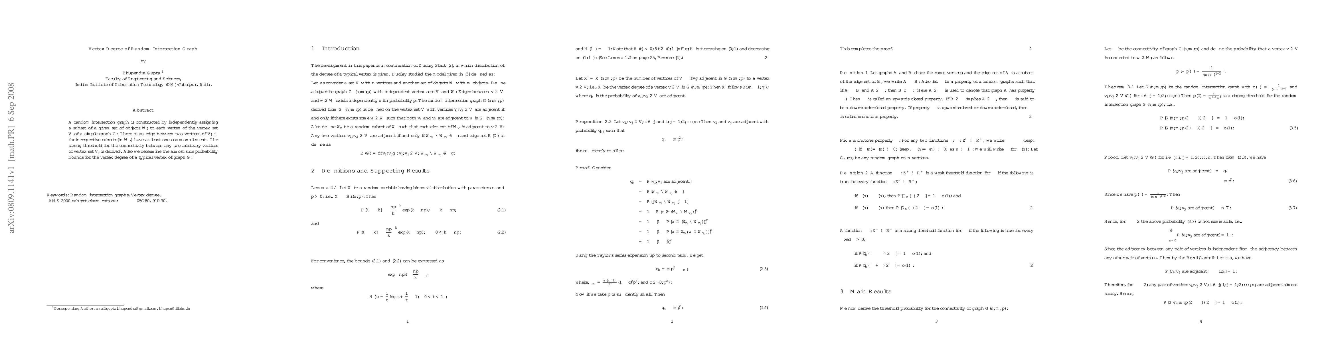 A random intersection graph is constructed by independently assigning a subset of a given set of objects $W,$ to each vertex of the vertex set $V$ of a simple graph $G.$ There is an edge between two vertices of $V,$ iff their respective subsets(in $W$,) have at least one common element. The strong threshold for the connectivity between any two arbitrary vertices of vertex set $V,$ is derived. Also we determine the almost sure probability bounds for the vertex degree of a typical vertex of graph $G.$