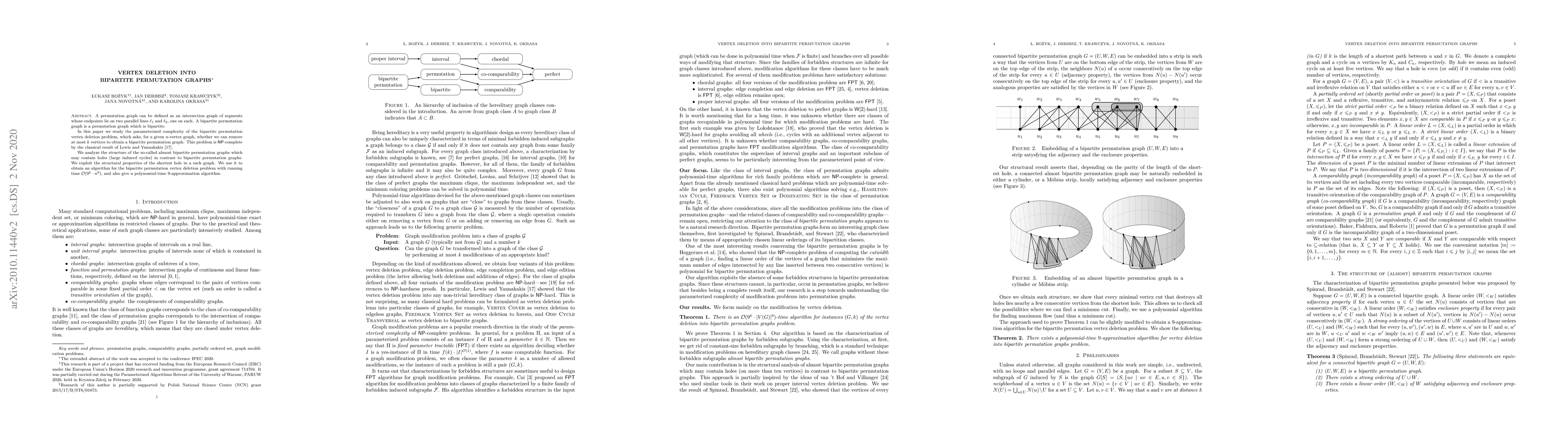 A permutation graph can be defined as an intersection graph of segments whose endpoints lie on two parallel lines $l_1$ and $l_2$, one on each. A bipartite permutation graph is a permutation graph which is bipartite. In this paper we study the parameterized complexity of the bipartite permutation vertex deletion problem, which asks, for a given n-vertex graph, whether we can remove at most k vertices to obtain a bipartite permutation graph. This problem is NP-complete by the classical result of Lewis and Yannakakis. We analyze the structure of the so-called almost bipartite permutation graphs which may contain holes (large induced cycles) in contrast to bipartite permutation graphs. We exploit the structural properties of the shortest hole in a such graph. We use it to obtain an algorithm for the bipartite permutation vertex deletion problem with running time $O(9^k\cdot n^9)$, and also give a polynomial-time 9-approximation algorithm.