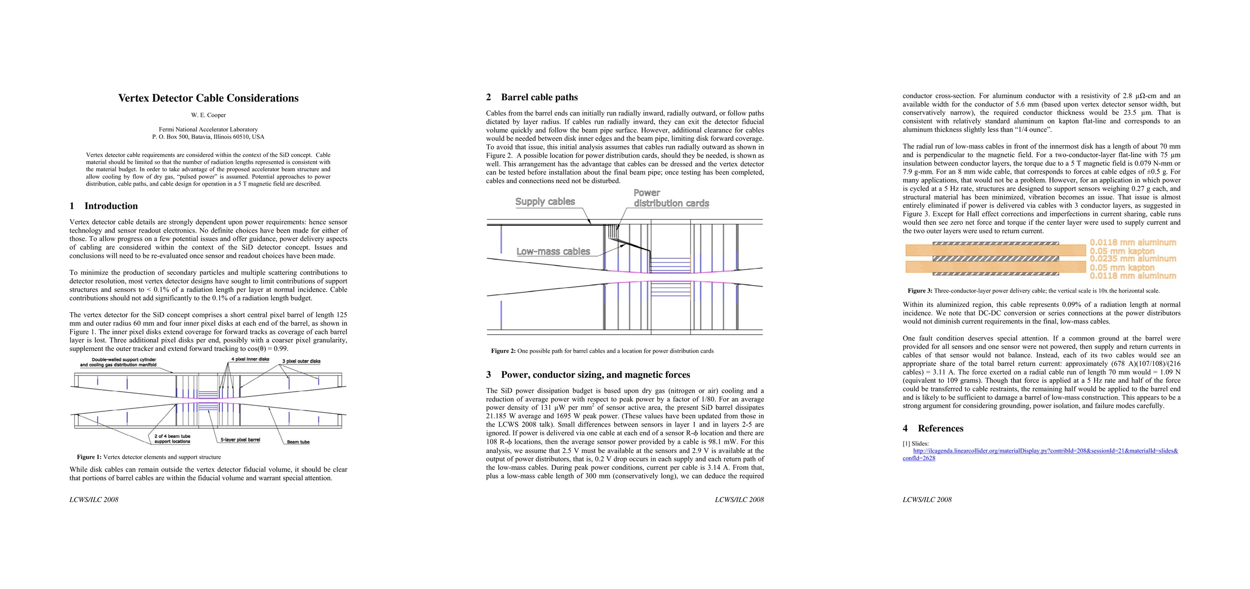 Vertex detector cable requirements are considered within the context of the SiD concept. Cable material should be limited so that the number of radiation lengths represented is consistent with the material budget. In order to take advantage of the proposed accelerator beam structure and allow cooling by flow of dry gas, pulsed power is assumed. Potential approaches to power distribution, cable paths, and cable design for operation in a 5 T magnetic field are described.