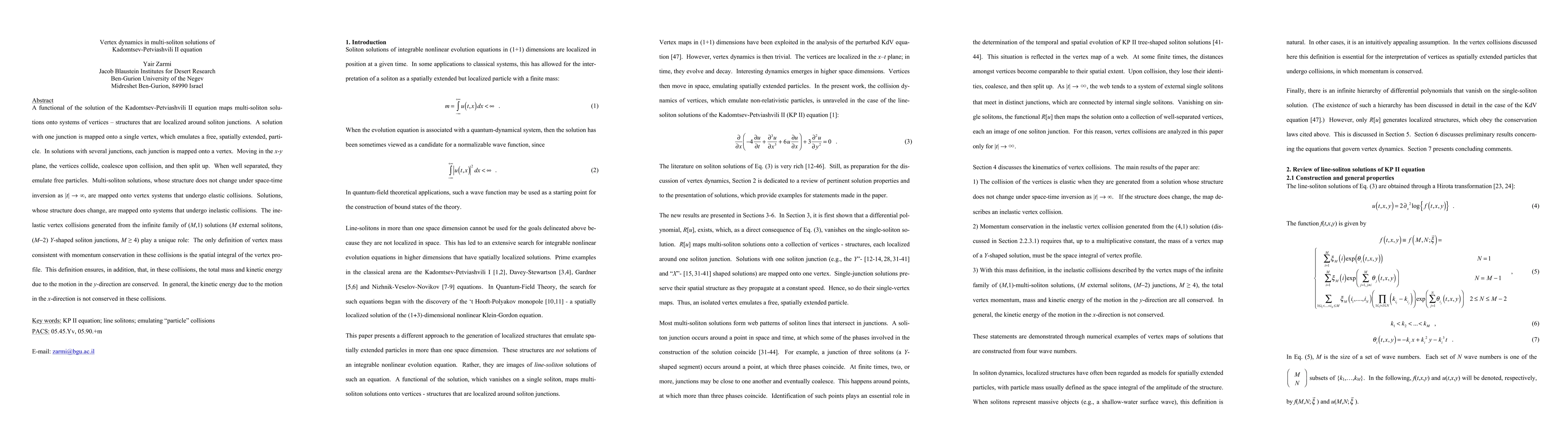 A functional of the solution of the Kadomtsev-Petviashvili II equation maps multi-soliton solutions onto systems of vertices - structures that are localized around soliton junctions. A solution with one junction is mapped onto a single vertex, which emulates a free, spatially extended, particle. In solutions with several junctions, each junction is mapped onto a vertex. Moving in the x-y plane, the vertices collide, coalesce upon collision, and then split up. When well separated, they emulate free particles. Multi-soliton solutions, whose structure does not change under space-time inversion as for infinite times, are mapped onto vertex systems that undergo elastic collisions. Solutions, whose structure does change, are mapped onto systems that undergo inelastic collisions. The inelastic vertex collisions generated from the infinite family of (M,1) solutions (M external solitons, (M-2) Y-shaped soliton junctions, M greater than 3) play a unique role: The only definition of vertex mass consistent with momentum conservation in these collisions is the spatial integral of the vertex profile. This definition ensures, in addition, that, in these collisions, the total mass and kinetic energy due to the motion in the y-direction are conserved. In general, the kinetic energy due to the motion in the x-direction is not conserved in these collisions.