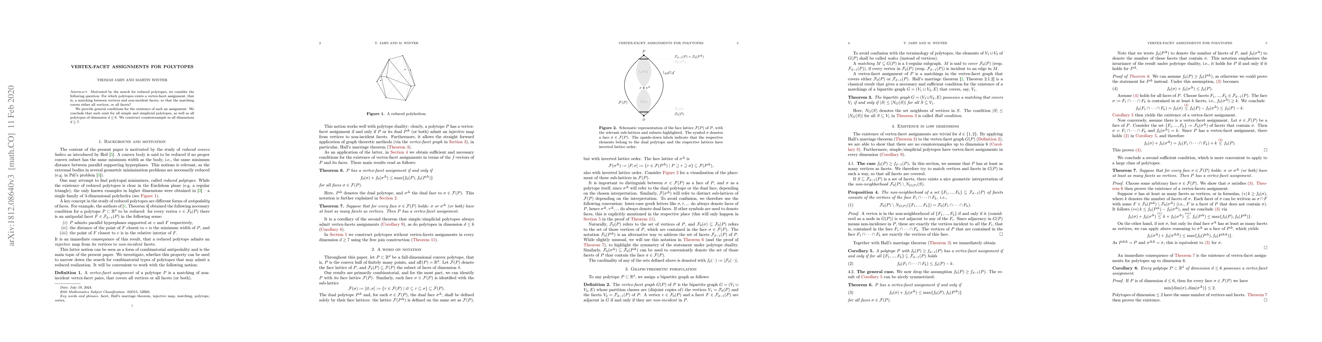 Motivated by the search for reduced polytopes, we consider the following question: For which polytopes exists a vertex-facet assignment, that is, a matching between vertices and non-incident facets, so that the matching covers either all vertices, or all facets? We provide general conditions for the existence of such an assignment. We conclude that such exist for all simple and simplicial polytopes, as well as all polytopes of dimension $d\le 6$. We construct counterexample in all dimensions $d\ge 7$.