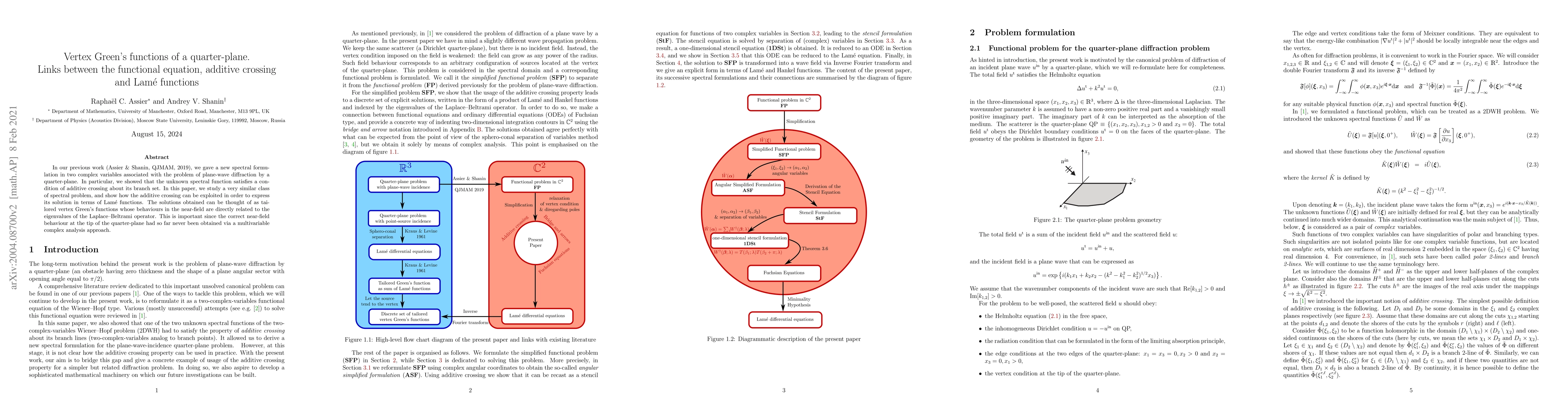 This paper explores a class of spectral problems similar to plane-wave diffraction by a quarter-plane, demonstrating how the additive crossing condition can be used to express solutions in terms of Lame functions. The derived vertex Green's functions provide accurate near-field behavior at the tip of the quarter-plane, previously unattainable through multivariable complex analysis.