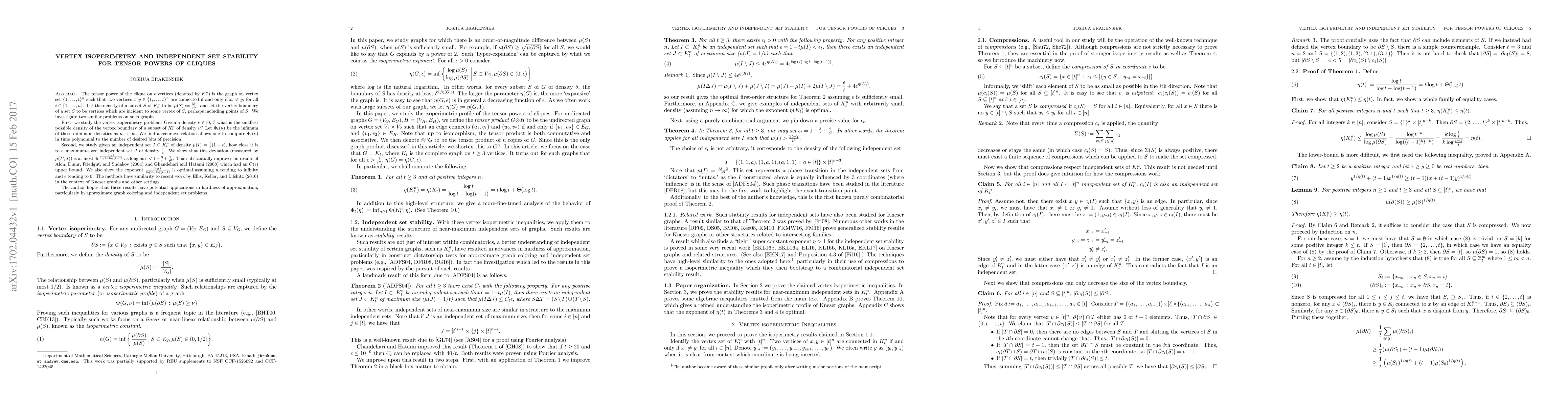 The tensor power of the clique on $t$ vertices (denoted by $K_t^n$) is the graph on vertex set $\{1, ..., t\}^n$ such that two vertices $x, y \in \{1, ..., t\}^n$ are connected if and only if $x_i \neq y_i$ for all $i \in \{1, ..., n\}$. Let the density of a subset $S$ of $K_t^n$ to be $\mu(S) := \frac{|S|}{t^n}$, and let the vertex boundary of a set $S$ to be vertices which are incident to some vertex of $S$, perhaps including points of $S$. We investigate two similar problems on such graphs. First, we study the vertex isoperimetry problem. Given a density $\nu \in [0, 1]$ what is the smallest possible density of the vertex boundary of a subset of $K_t^n$ of density $\nu$? Let $\Phi_t(\nu)$ be the infimum of these minimum densities as $n \to \infty$. We find a recursive relation allows one to compute $\Phi_t(\nu)$ in time polynomial to the number of desired bits of precision. Second, we study given an independent set $I \subseteq K_t^n$ of density $\mu(I) = \frac{1}{t}(1-\epsilon)$, how close it is to a maximum-sized independent set $J$ of density $\frac{1}{t}$. We show that this deviation (measured by $\mu(I \setminus J)$) is at most $4\epsilon^{\frac{\log t}{\log t - \log(t-1)}}$ as long as $\epsilon < 1 - \frac{3}{t} + \frac{2}{t^2}$. This substantially improves on results of Alon, Dinur, Friedgut, and Sudakov (2004) and Ghandehari and Hatami (2008) which had an $O(\epsilon)$ upper bound. We also show the exponent $\frac{\log t}{\log t - \log(t-1)}$ is optimal assuming $n$ tending to infinity and $\epsilon$ tending to $0$. The methods have similarity to recent work by Ellis, Keller, and Lifshitz (2016) in the context of Kneser graphs and other settings. The author hopes that these results have potential applications in hardness of approximation, particularly in approximate graph coloring and independent set problems.
