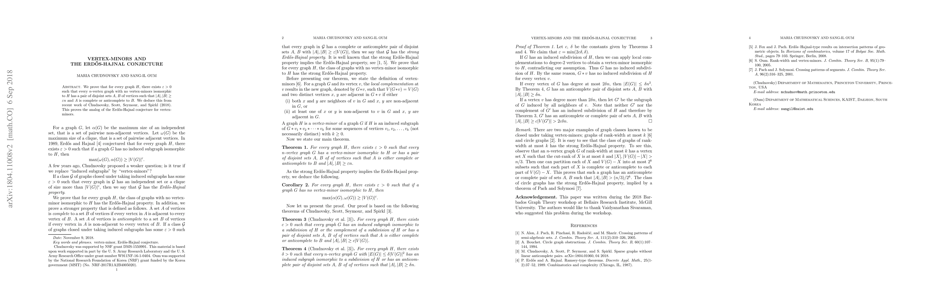 Summary: The research proves that graphs without a specific vertex-minor contain large disjoint complete or anticomplete sets, confirming a vertex-minor version of the Erdős-Hajnal conjecture, using foundational work by Chudnovsky et al. (2018).