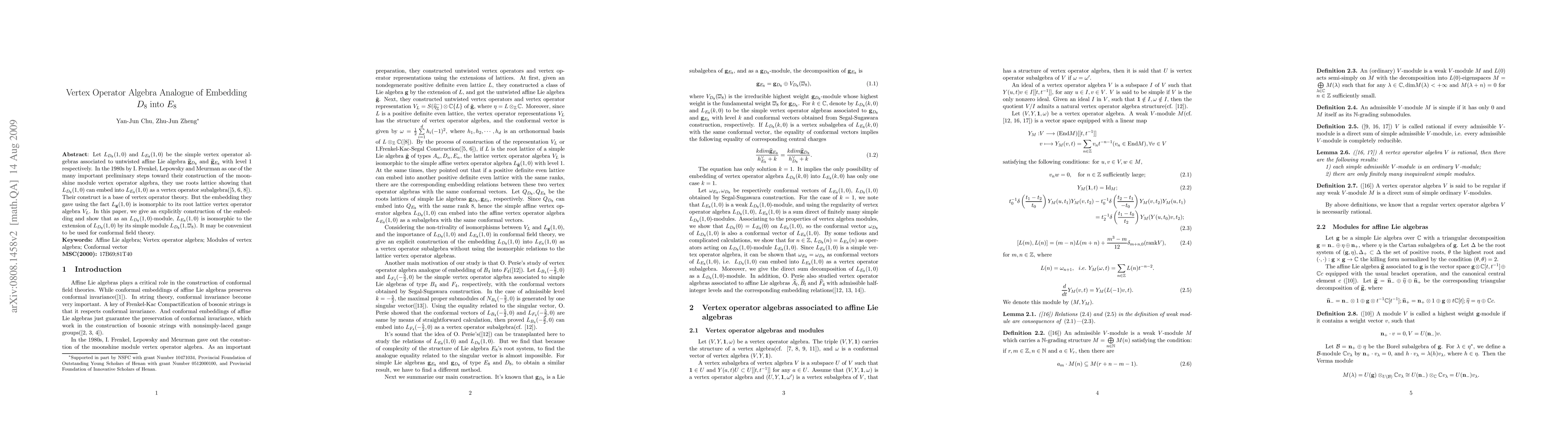 Let $L_{D_8}(1, 0)$ and $L_{E_8}(1, 0)$ be the simple vertex operator algebras associated to untwisted affine Lie algebra $\widehat{{\mathbf g}}_{D_{8}}$ and $\widehat{{\mathbf g}}_{E_8}$ with level 1 respectively. In the 1980s by I. Frenkel, Lepowsky and Meurman as one of the many important preliminary steps toward their construction of the moonshine module vertex operator algebra, they use roots lattice showing that $L_{D_8}(1, 0)$ can embed into $L_{E_8}(1, 0)$ as a vertex operator subalgebra(\cite{5, 6, 8}). Their construct is a base of vertex operator theory. But the embedding they gave using the fact $L_{\mathbf g}(1,0)$ is isomorphic to its root lattice vertex operator algebra $V_L$. In this paper, we give an explicitly construction of the embedding and show that as an $L_{D_8}(1, 0)$-module, $L_{E_8}(1, 0)$ is isomorphic to the extension of $L_{D_8}(1, 0)$ by its simple module $L_{D_8}(1, \overline{\omega}_8)$. It may be convenient to be used for conformal field theory.