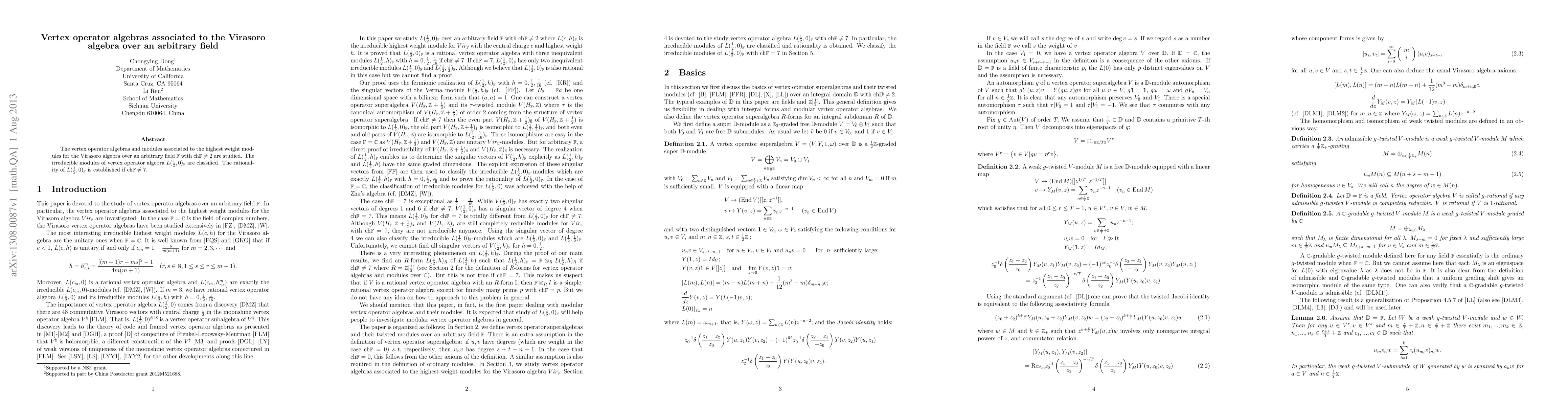The vertex operator algebras and modules associated to the highest weight modules for the Virasoro algebra over an arbitrary field F whose characteristic is not equal to 2 are studied. The irreducible modules of vertex operator algebra L(1/2,0)_F are classified. The rationality of L(1/2,0)_F is established if the characteristic of F is different from 7.