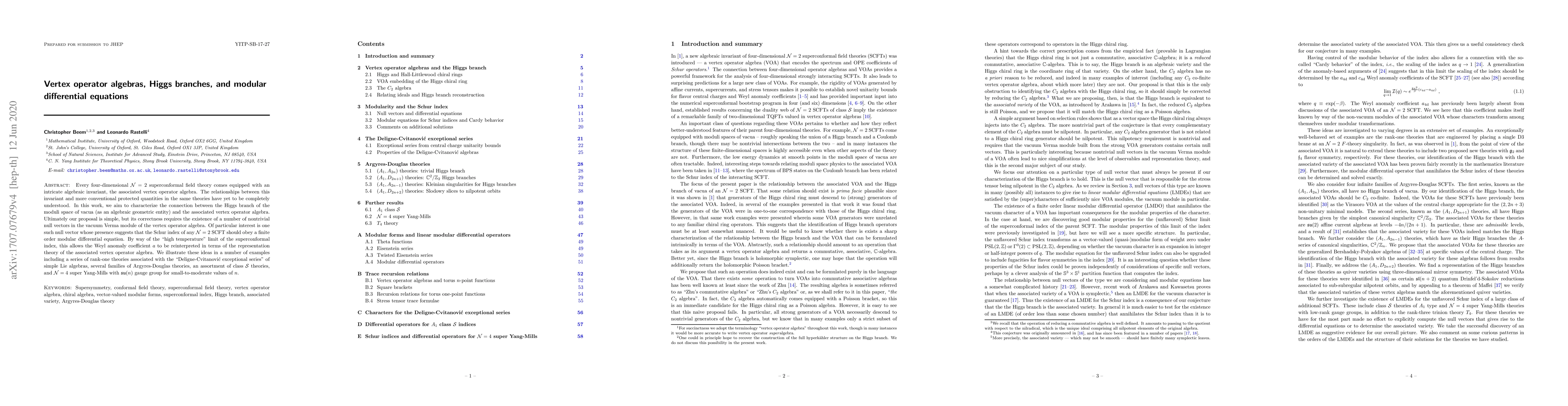 Every four-dimensional ${\cal N}=2$ superconformal field theory comes equipped with an intricate algebraic invariant, the associated vertex operator algebra. The relationships between this invariant and more conventional protected quantities in the same theories have yet to be completely understood. In this work, we aim to characterize the connection between the Higgs branch of the moduli space of vacua (as an algebraic geometric entity) and the associated vertex operator algebra. Ultimately our proposal is simple, but its correctness requires the existence of a number of nontrivial null vectors in the vacuum Verma module of the vertex operator algebra. Of particular interest is one such null vector whose presence suggests that the Schur index of any ${\cal N}=2$ SCFT should obey a finite order modular differential equation. By way of the "high temperature" limit of the superconformal index, this allows the Weyl anomaly coefficient $a$ to be reinterpreted in terms of the representation theory of the associated vertex operator algebra. We illustrate these ideas in a number of examples including a series of rank-one theories associated with the "Deligne-Cvitanovi\'c exceptional series" of simple Lie algebras, several families of Argyres-Douglas theories, an assortment of class ${\cal S}$ theories, and ${\cal N}=4$ super Yang-Mills with $\mathfrak{su}(n)$ gauge group for small-to-moderate values of $n$.