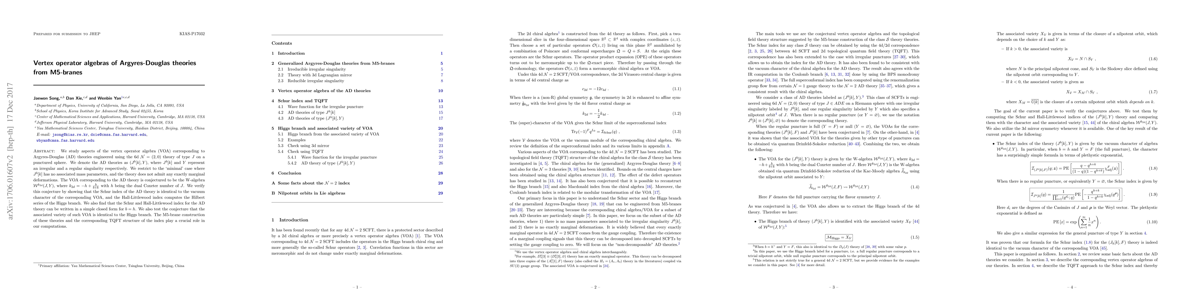 This paper studies the vertex operator algebra (VOA) for Argyres-Douglas theories derived from 6d N=(2, 0) theories on punctured spheres. It verifies a conjecture that the VOA corresponds to the W-algebra $\mathcal{W}^{k_{2d}}(J,Y)$, confirming this through the equivalence between the Schur index of the theory and the vacuum character of the VOA.