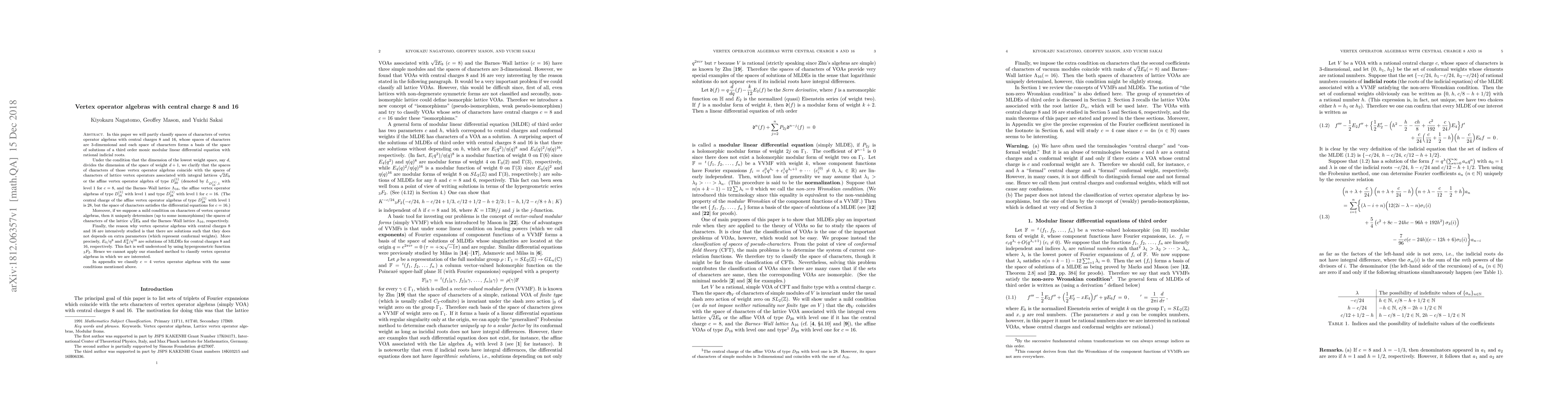 We will partially classify spaces of characters of vertex operator algebras $V$ with central charges 8 and 16, such that the spaces of characters is 3-dimensional and the characters forms a basis of the solution space of a third order monic modular linear differential equation with rational indicial roots. Assuming a mild arithmetic condition, we show that the space of characters of $V$ coincides with the space of characters of lattice vertex operators associated with integral lattices $\sqrt{2}E_8$ or the affine vertex operator algebra of type $D_{20}^{(1)}$ for $c=8$, and the Barnes--Wall lattice $\Lambda_{16}$, the affine vertex operator algebras of type $D_{16}^{(1)}$ with level 1 and type $D_{28}^{(1)}$ with level 1 for $c=16$. (The central charge of the affine vertex operator algebra of type $D_{28}^{(1)}$ with level 1 is 28, but the space of characters satisfies the differential equations for $c=16$.) Supposing a mild condition on characters of $V$, then it uniquely determines (up to isomorphism) the spaces of characters of the lattice $\sqrt{2}E_8$ and the Barnes--Wall lattice $\Lambda_{16}$, respectively. The reason why vertex operator algebras with central charges 8 and 16 are intensively studied is that there are solutions which do not depend on extra parameters (which represent conformal weights). This fact is well understood using the hypergeometric function $3F2$. Hence we cannot apply our standard method to classify vertex operator algebras in which we are interested. In appendix we classify $c=4$ vertex operator algebras with the same conditions mentioned above.