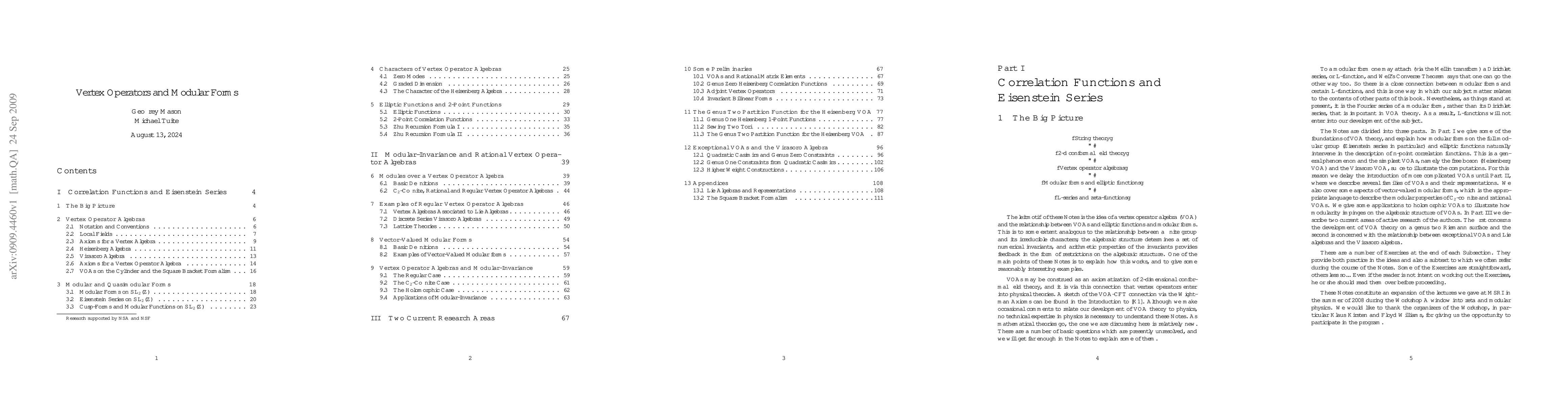 The leitmotif of these Notes is the idea of a vertex operator algebra (VOA) and the relationship between VOAs and elliptic functions and modular forms. This is to some extent analogous to the relationship between a finite group and its irreducible characters; the algebraic structure determines a set of numerical invariants, and arithmetic properties of the invariants provides feedback in the form of restrictions on the algebraic structure. One of the main points of these Notes is to explain how this works, and to give some reasonably interesting examples.