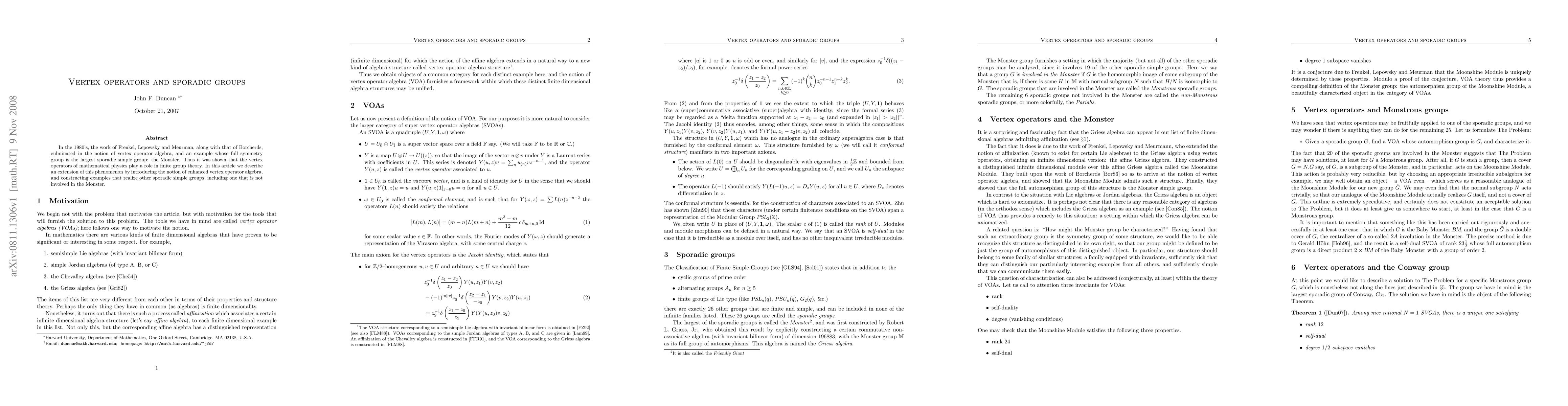 In the 1980's, the work of Frenkel, Lepowsky and Meurman, along with that of Borcherds, culminated in the notion of vertex operator algebra, and an example whose full symmetry group is the largest sporadic simple group: the Monster. Thus it was shown that the vertex operators of mathematical physics play a role in finite group theory. In this article we describe an extension of this phenomenon by introducing the notion of enhanced vertex operator algebra, and constructing examples that realize other sporadic simple groups, including one that is not involved in the Monster.