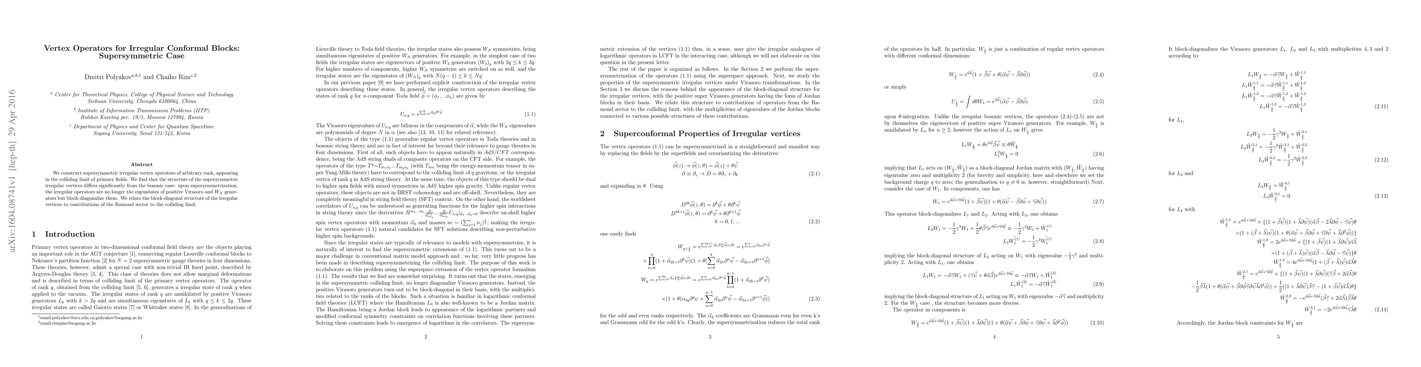 Researchers develop supersymmetric irregular vertex operators for conformal blocks, revealing a block-diagonal structure that relates to the Ramond sector and differs from bosonic cases.