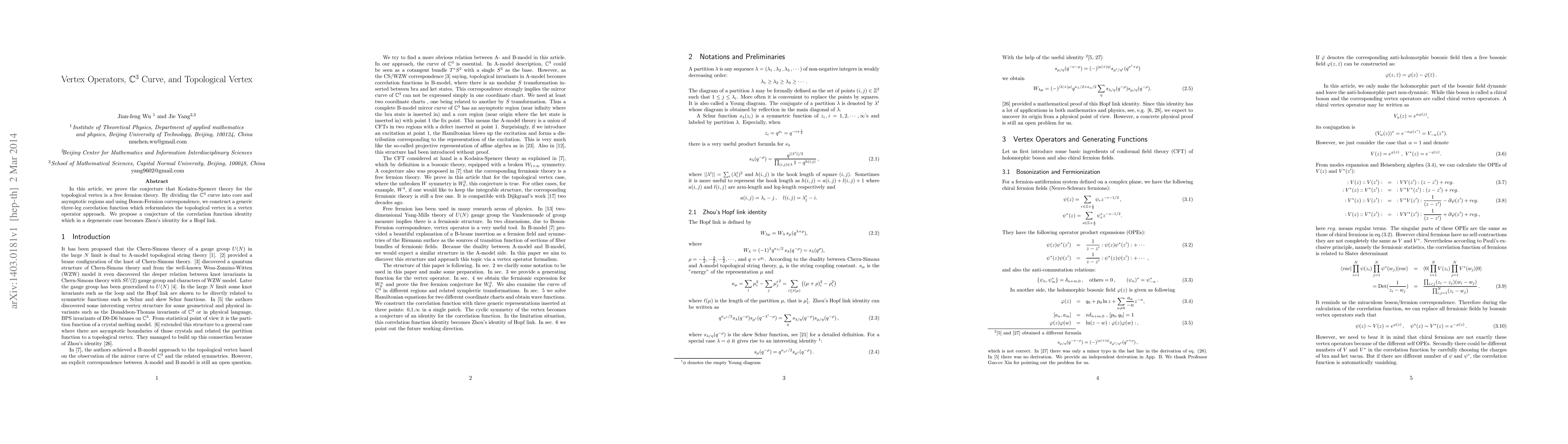 This paper proves that the Kodaira-Spencer theory for the topological vertex aligns with a free fermion theory. By segmenting the $\mathbb{C}^3$ curve into core and asymptotic regions and employing Boson-Fermion correspondence, the authors construct a three-leg correlation function reformulating the topological vertex via vertex operators, and propose a conjecture of its identity.