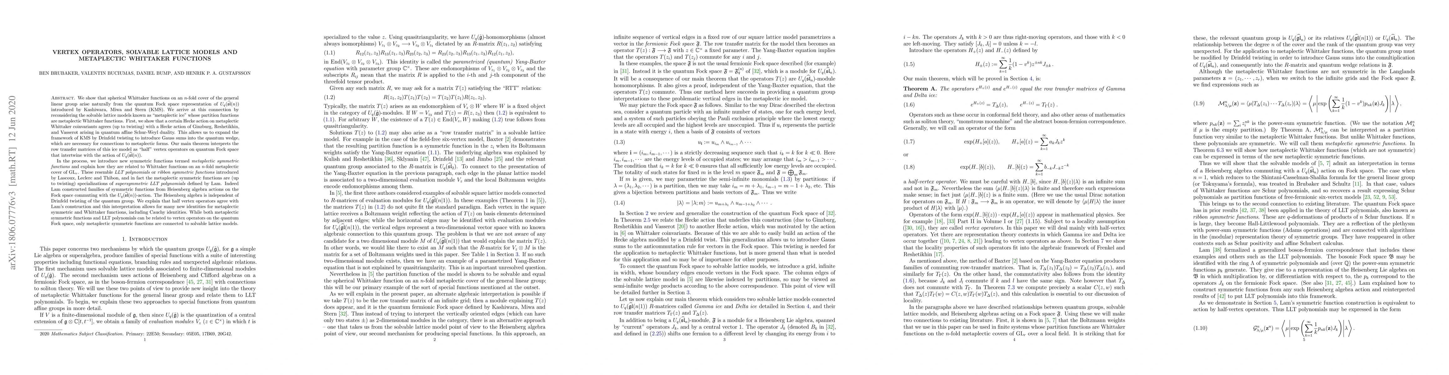The paper establishes a connection between spherical Whittaker functions, vertex operators, and solvable lattice models, specifically metaplectic ice. It introduces metaplectic symmetric functions as a new class of symmetric functions, showing their relation to metaplectic Whittaker functions and their role in quantum Fock space representations of $U_q(\widehat{\mathfrak{sl}}(n))$.