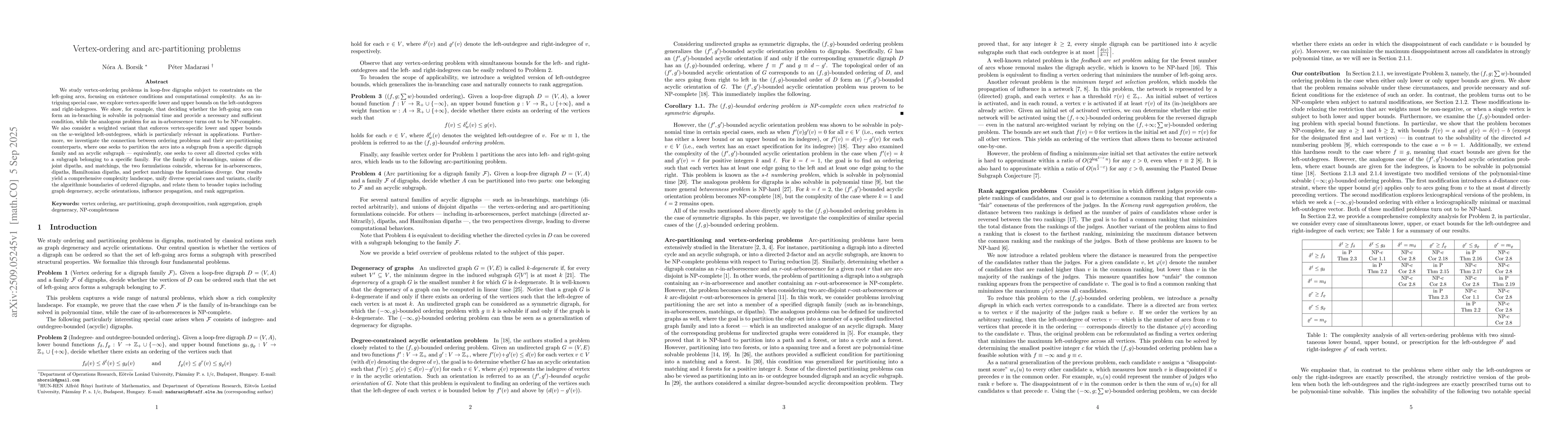 We study vertex-ordering problems in loop-free digraphs subject to constraints on the left-going arcs, focusing on existence conditions and computational complexity. As an intriguing special case, we explore vertex-specific lower and upper bounds on the left-outdegrees and right-indegrees. We show, for example, that deciding whether the left-going arcs can form an in-branching is solvable in polynomial time and provide a necessary and sufficient condition, while the analogous problem for an in-arborescence turns out to be NP-complete. We also consider a weighted variant that enforces vertex-specific lower and upper bounds on the weighted left-outdegrees, which is particularly relevant in applications. Furthermore, we investigate the connection between ordering problems and their arc-partitioning counterparts, where one seeks to partition the arcs into a subgraph from a specific digraph family and an acyclic subgraph -- equivalently, one seeks to cover all directed cycles with a subgraph belonging to a specific family. For the family of in-branchings, unions of disjoint dipaths, and matchings, the two formulations coincide, whereas for in-arborescences, dipaths, Hamiltonian dipaths, and perfect matchings the formulations diverge. Our results yield a comprehensive complexity landscape, unify diverse special cases and variants, clarify the algorithmic boundaries of ordered digraphs, and relate them to broader topics including graph degeneracy, acyclic orientations, influence propagation, and rank aggregation.