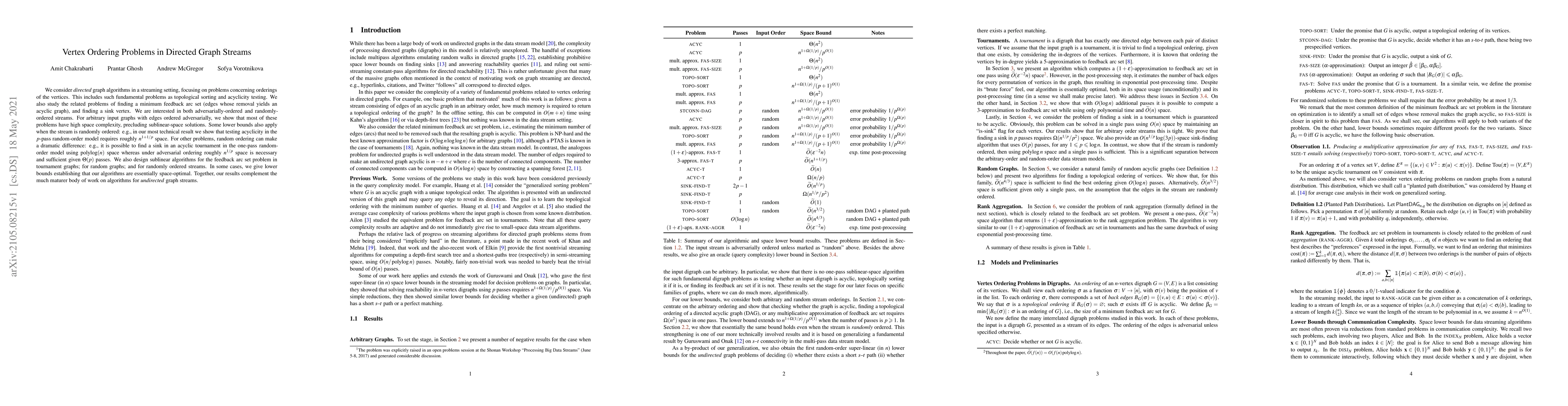 This paper investigates vertex ordering problems in directed graph streams, focusing on topological sorting, acyclicity testing, and finding minimum feedback arc sets. It demonstrates high space complexity for adversarially-ordered streams but shows that random ordering can significantly reduce space requirements, especially for finding sinks in tournaments. The study also designs sublinear algorithms for feedback arc set problems in various graph types and establishes lower bounds for space complexity.