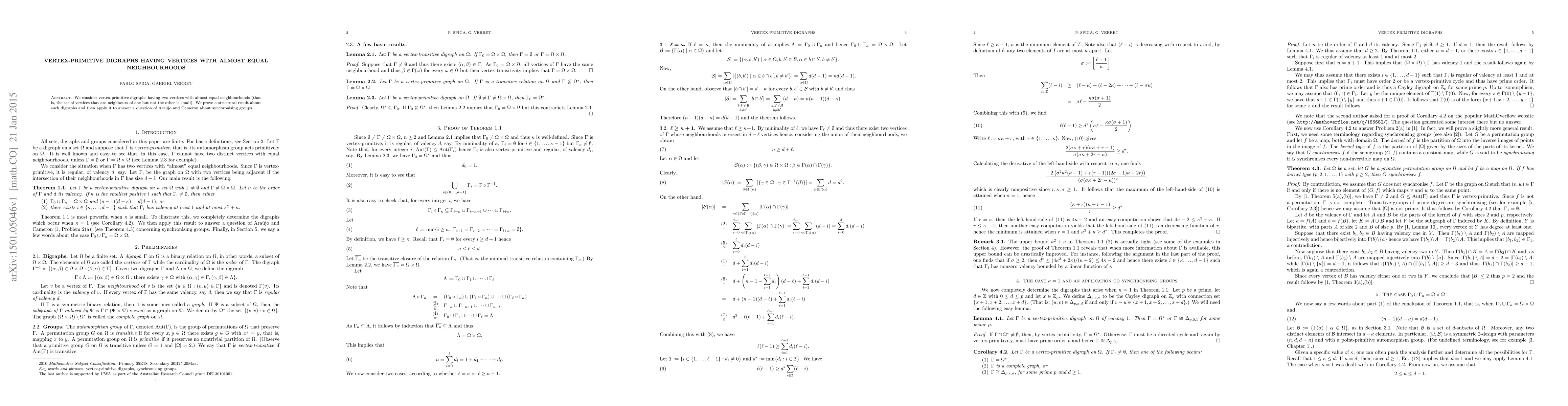 This paper investigates vertex-primitive digraphs where two vertices have almost equal neighborhoods, proving a structural result with implications for synchronizing groups.
