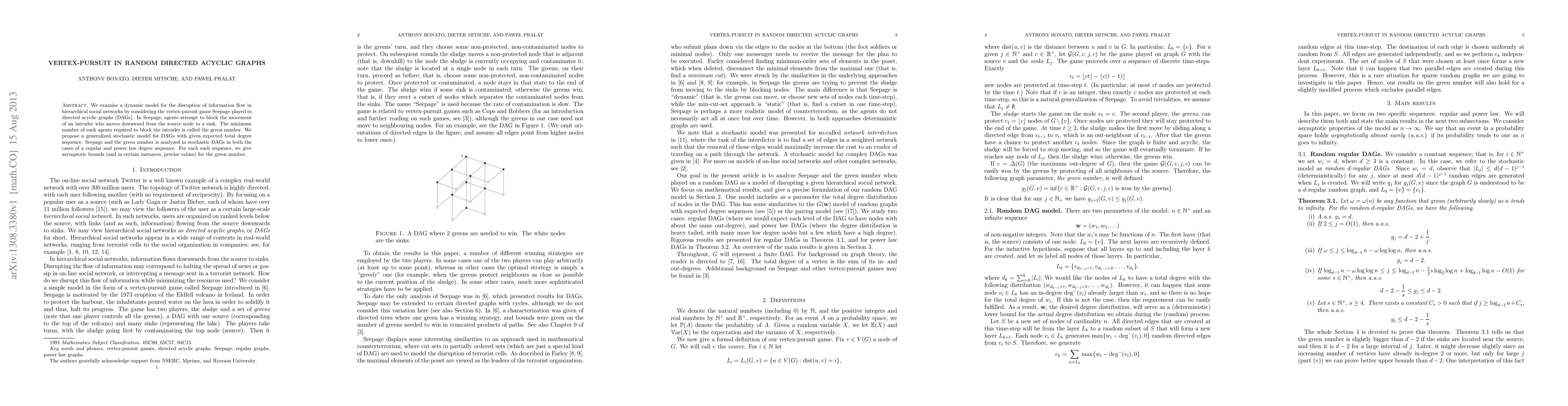 This paper studies a dynamic model called the Seepage game in random directed acyclic graphs (DAGs) to analyze the disruption of information flow in hierarchical networks. It proposes a generalized stochastic model for DAGs and provides asymptotic bounds for the green number, which represents the minimum number of agents needed to block an intruder's downward movement, under both regular and power law degree sequences.
