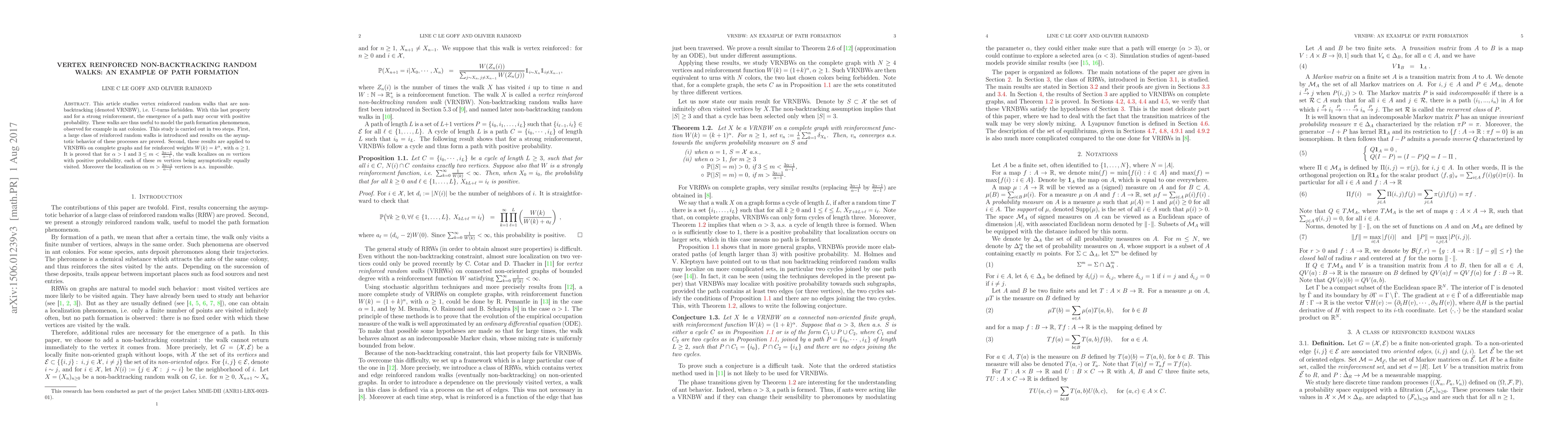 This paper investigates vertex reinforced non-backtracking random walks (VRNBW), where U-turns are forbidden, and demonstrates their utility in modeling path formation, such as in ant colonies. It proves that for certain reinforcement weights, the walk localizes on a specific number of vertices with positive probability, showing the emergence of a path formation phenomenon.
