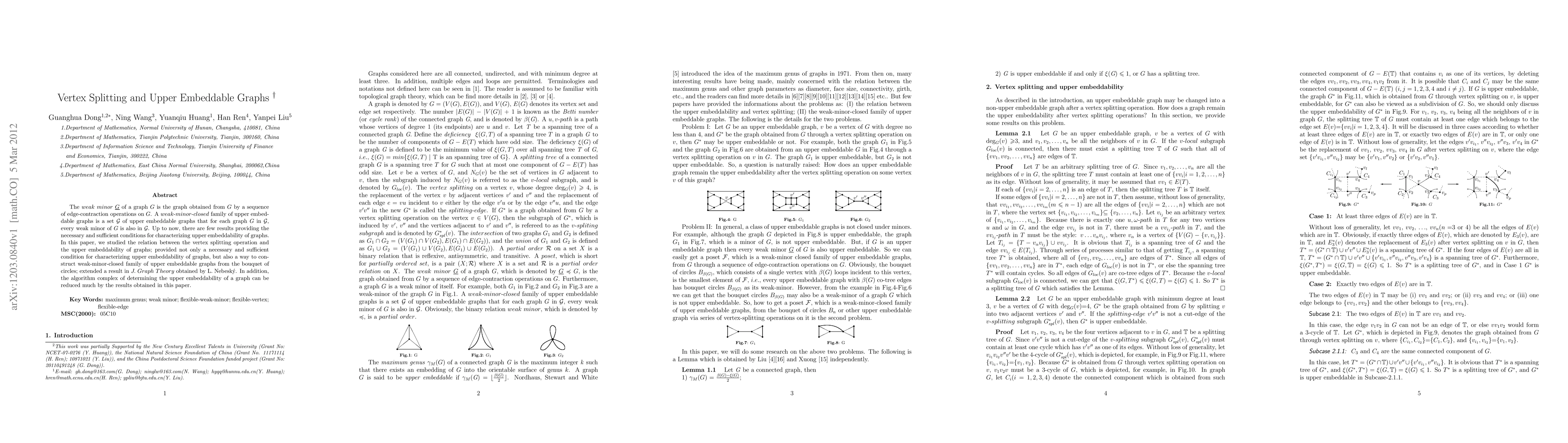 This paper investigates the relationship between vertex splitting and upper embeddability of graphs, providing a necessary and sufficient condition for characterizing such graphs. It also constructs weak-minor-closed families of upper embeddable graphs and simplifies the algorithm complexity for determining upper embeddability.