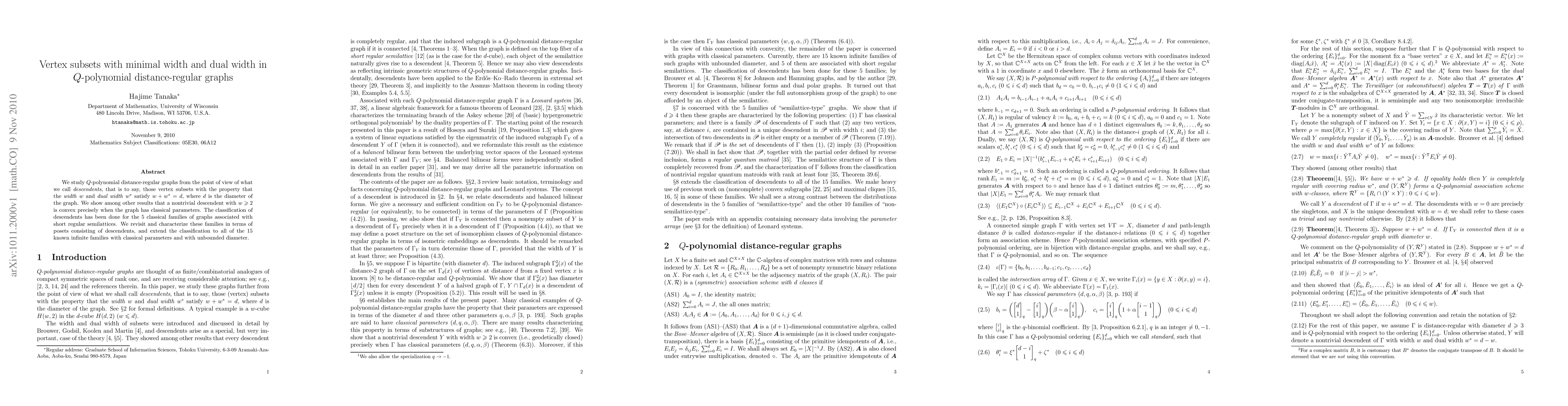 We study $Q$-polynomial distance-regular graphs from the point of view of what we call descendents, that is to say, those vertex subsets with the property that the width $w$ and dual width $w^*$ satisfy $w+w^*=d$, where $d$ is the diameter of the graph. We show among other results that a nontrivial descendent with $w\ge 2$ is convex precisely when the graph has classical parameters. The classification of descendents has been done for the 5 classical families of graphs associated with short regular semilattices. We revisit and characterize these families in terms of posets consisting of descendents, and extend the classification to all of the 15 known infinite families with classical parameters and with unbounded diameter.