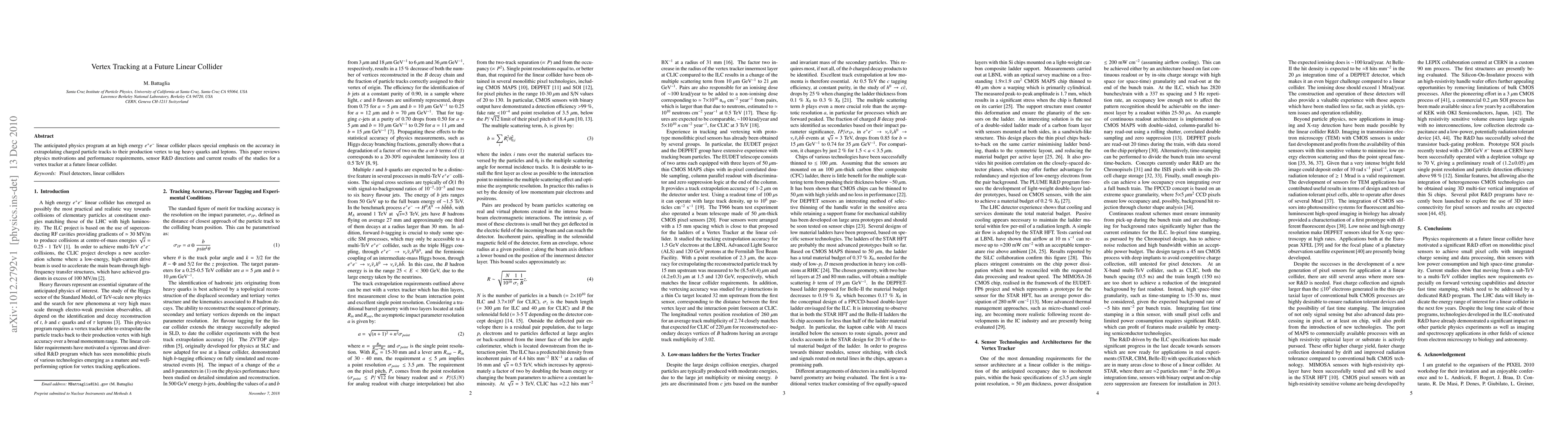 This paper reviews the physics motivations and performance requirements for a vertex tracker at a future linear collider, focusing on accurately extrapolating charged particle tracks to their production vertex for tagging heavy quarks and leptons, and discusses sensor R&D directions and current study results.