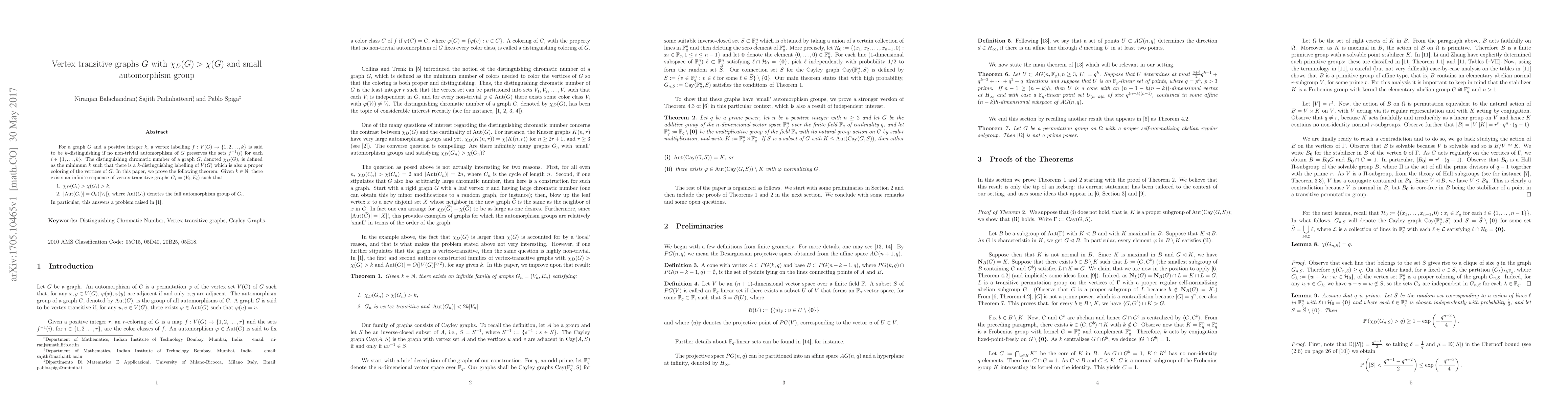 This paper presents an infinite sequence of vertex-transitive graphs where the distinguishing chromatic number (chi_D(G)) exceeds the standard chromatic number (chi(G)) by more than a given integer k, while the automorphism group size (|Aut(G)|) grows sublinearly with the number of vertices (|V_i|). This resolves a previously stated problem in graph theory concerning the relationship between distinguishing chromatic number, automorphism group size, and vertex-transitive graphs.